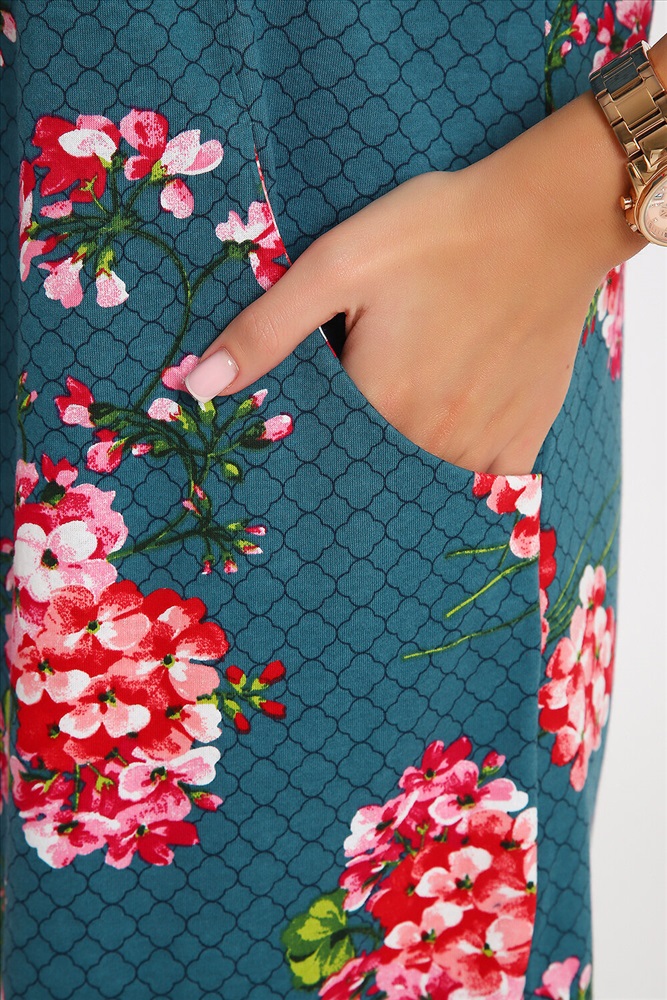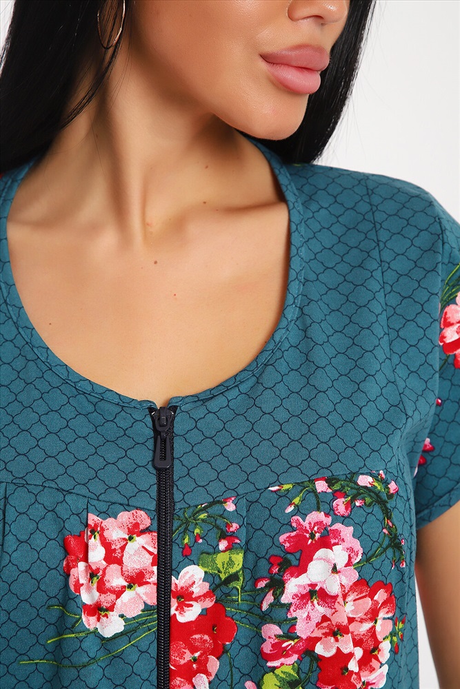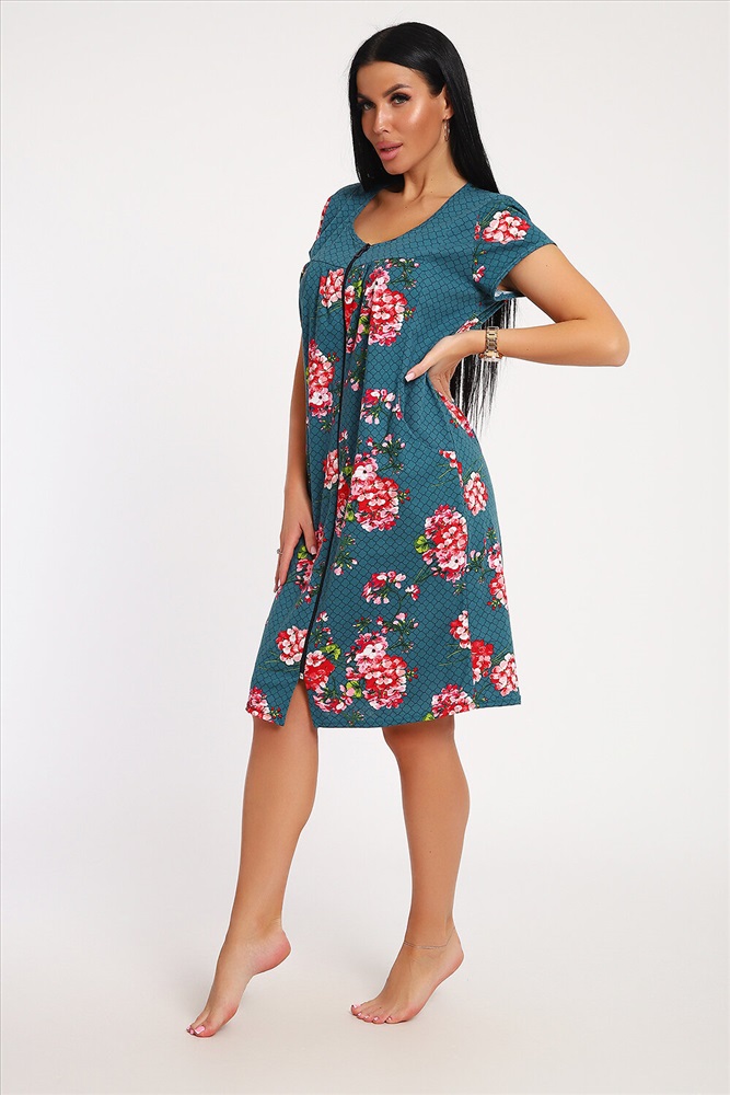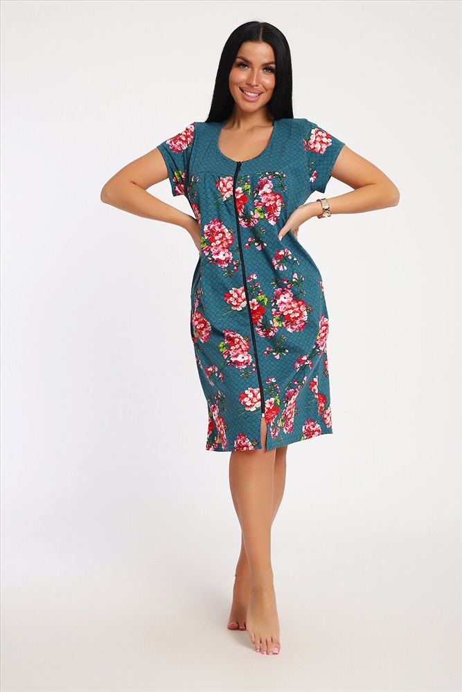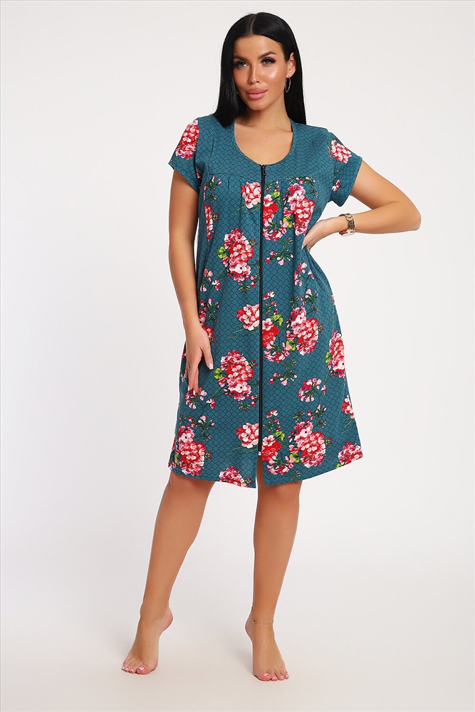 Халат женский на молнии из комбинированного хлопкового трикотажа с яркими соцветиями на контрастном фоне. Модель слегка приталенного силуэта с рельефами, на груди кокетка, втачной короткий рукав, в рельефах удобные карманы. Легкий, приятный к телу халатик сочетает в себе комфорт и элегантность, добавит вашему образу яркости и индивидуальности. Модель представлена в широком размере ряде до 62 размера. Халат прекрасно подходит на любой тип фигуры, подчеркнет вашу женственность и создаст атмосферу уюта дома и на даче.