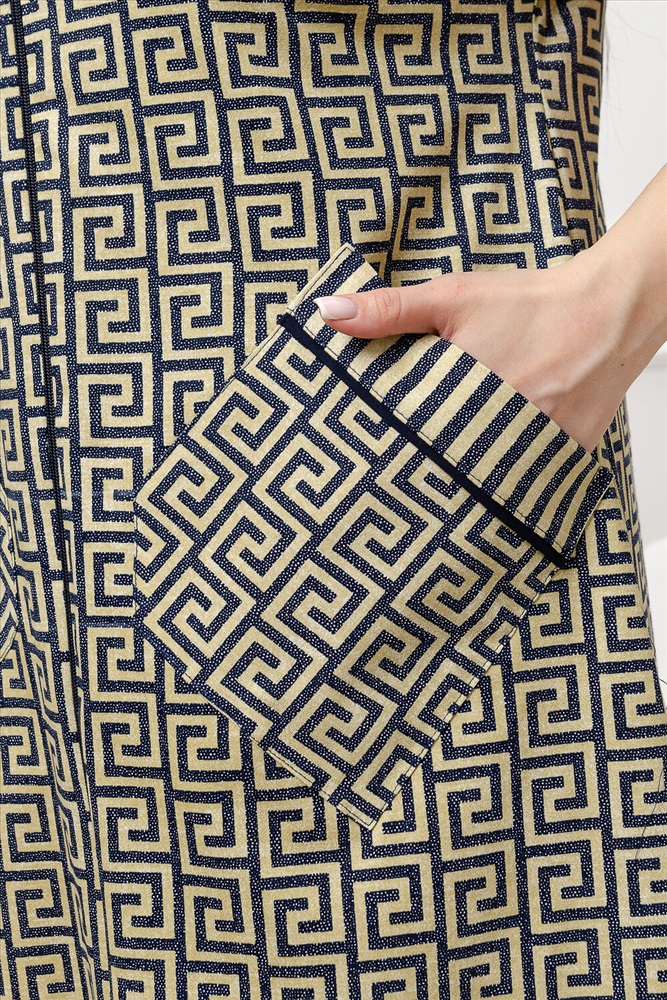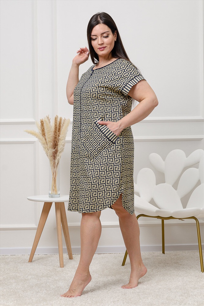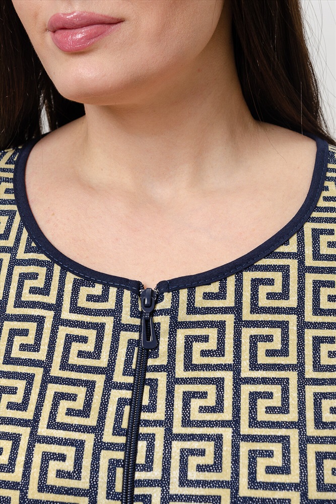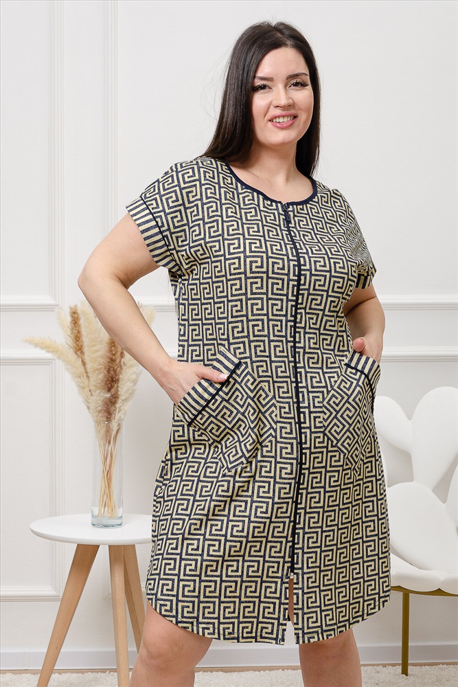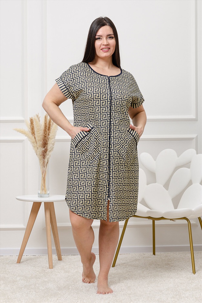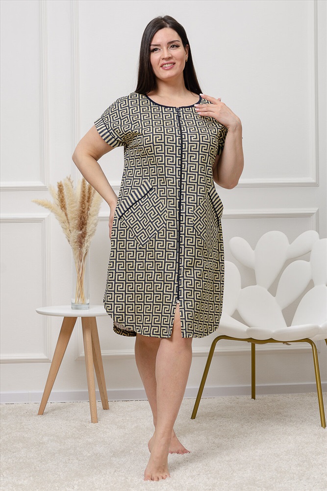 Халат на молнии, прямого силуэта, длиной выше колена, с фигурной линией низа, с удлиненной спинкой, с округлой горловиной, с накладными карманами с обтачкой из отделочного полотна. Рукав цельнокроеный, короткий, с манжетом из отделочного полотна. Горловина обработана бейкой из контрастного полотна.