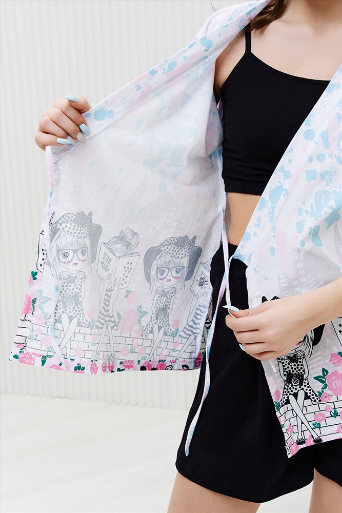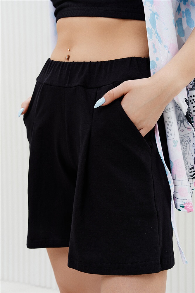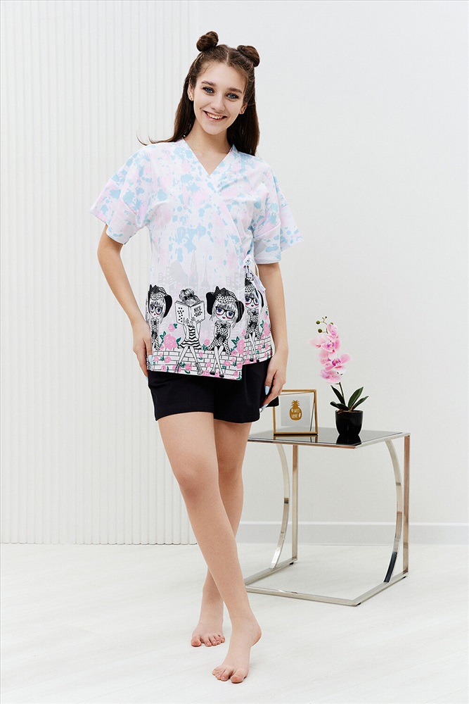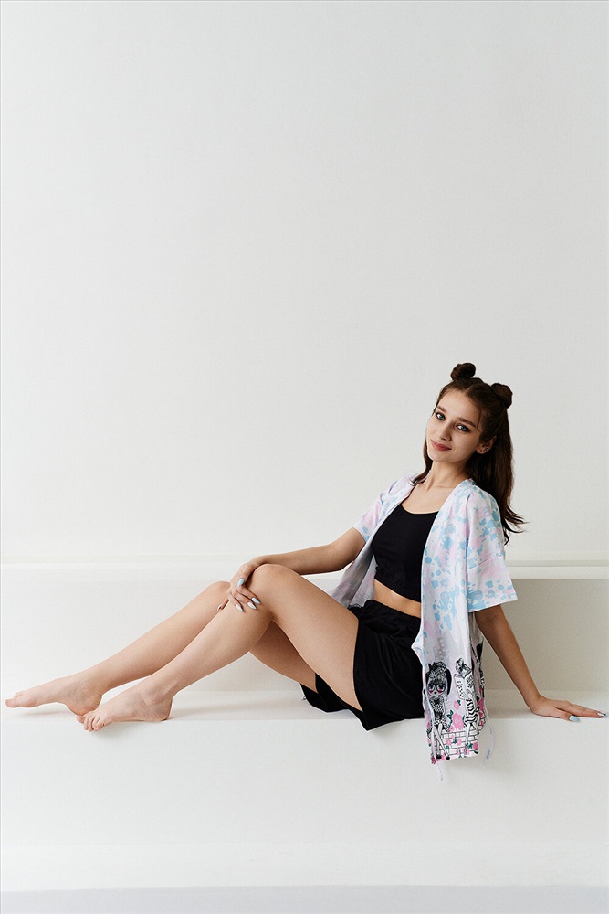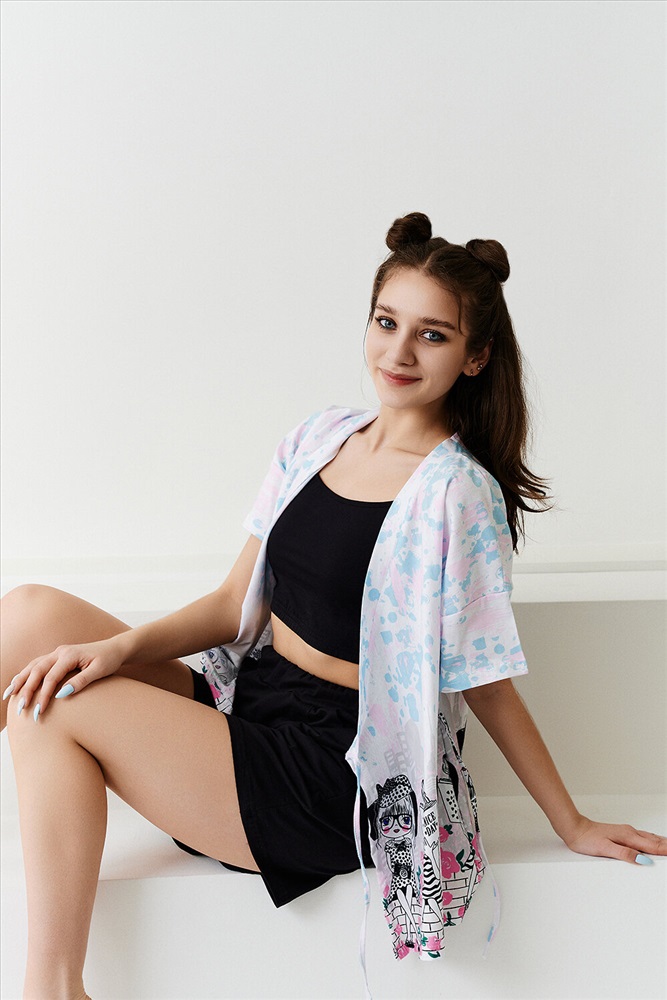 Комплект состоит из топа, шорт и короткого кимоно. Топ из эластичного полотна, на тонких бретелях, длиной выше линии талии, с резинкой по низу. Горловина и бретели топа обработаны бейкой из основного полотна. Шорты из кулирки с лайкрой на поясе, с боковыми карманами. В верхней части передних половинок по шву притачивания пояса расположены складки. Кимоно выполнено из отделочного полотна из кулирки, полуприлегающего силуэта, длиной до середины бедра, с коротким рукавом. Горловина обработана обтачкой.