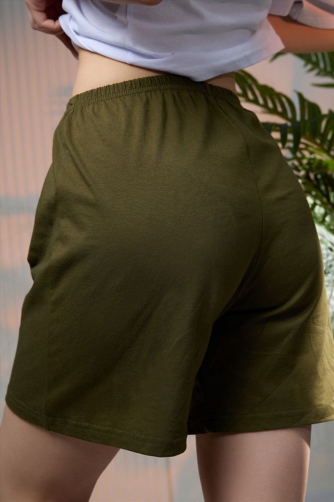 Костюм состоит из укороченной футболки оверсайз и шорт. Футболка с округлой горловиной. Рукав короткий. Горловина обработана бейкой из основного полотна. Шорты на резинке, со складками в верхней части передних половинок.