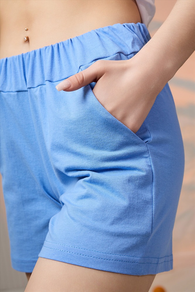 Комплект состоит из майки и шорт. Майка на тонких бретелях, с V-образной горловиной на полочке. Горловина и бретели обработаны бейкой из отделочного полотна. Шорты прямые, с карманами, на поясе.
