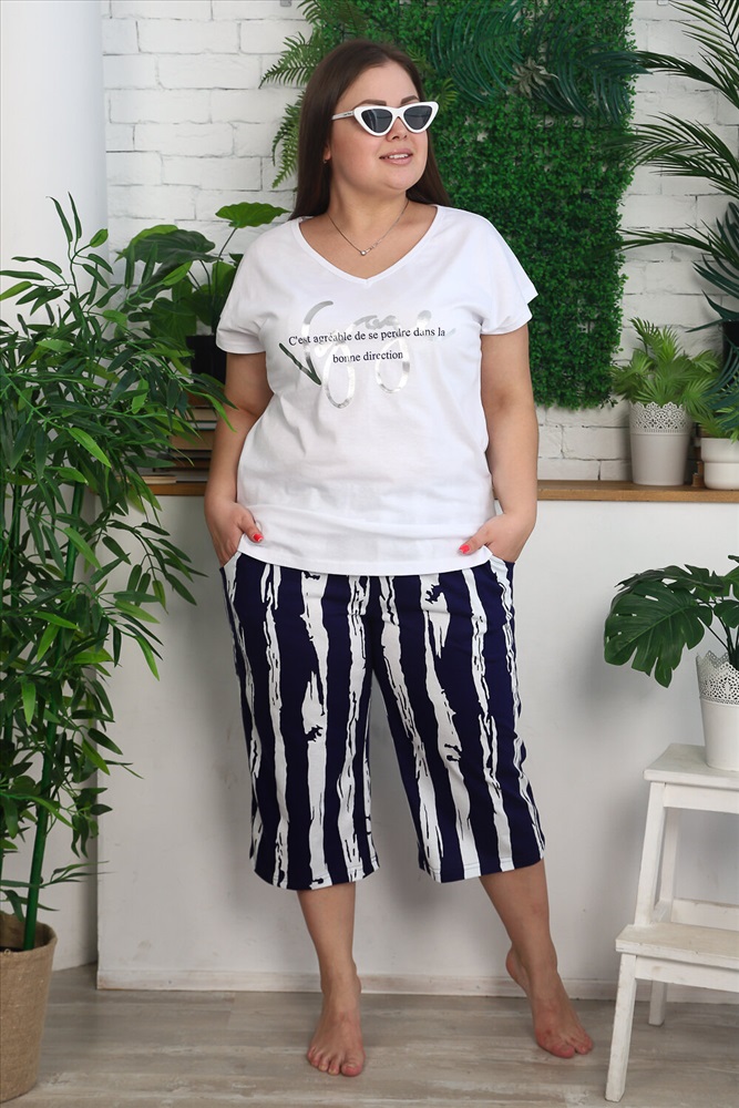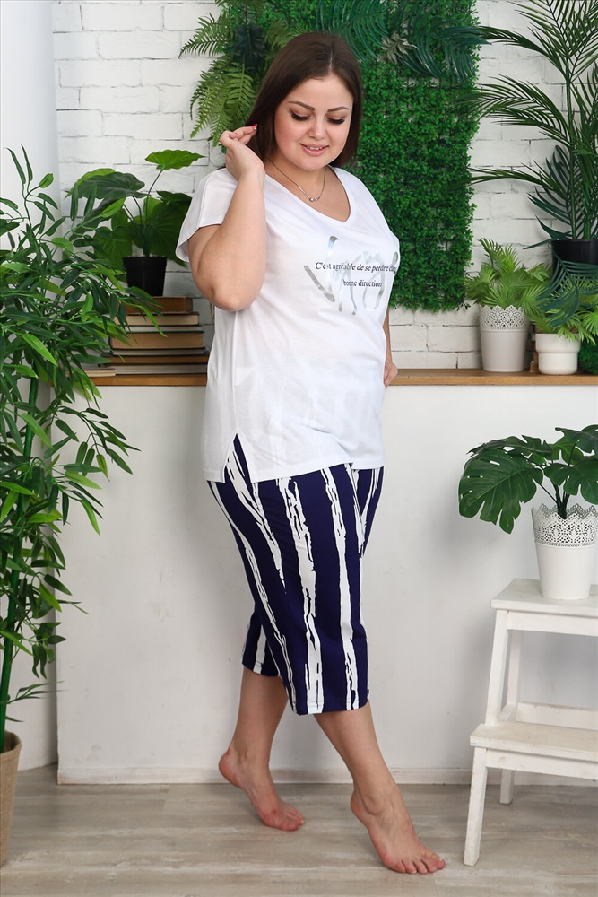 Костюм женский: футболка и бриджи. Футболка прямого силуэта, рукав цельнокроенный короткий, вырез V-образный, в боковом шве разрезы. На полочке модный принт. Бриджи полуприлегающие, длина ниже колена, с хорошей прибавкой на свободу движений. На передней части брюк внутренние карманы. На модели 52 размер. На фото майка из той же коллекции 9126
