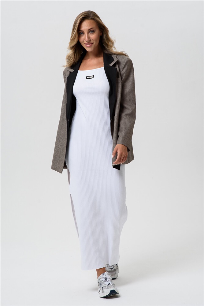 Длинное спортивное платье приталенного силуэта на тонких брительках.Мягкая ткань в рубчик обеспечивает комфорт.Идиальный вариант на каждый день или в отпуск,на море или путешествий и отдыха.Длинное сексуальное платье с разрезом идеально сочетается с любой спортивной обувью будь,то кросовки,кеды,сандали.