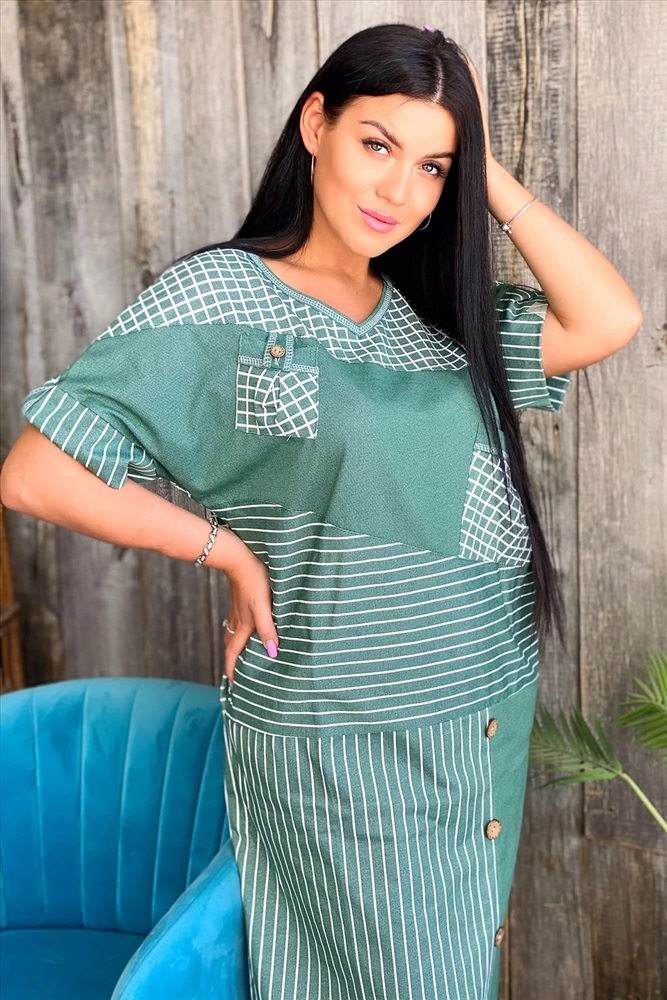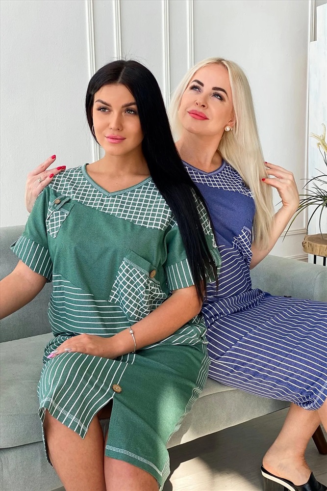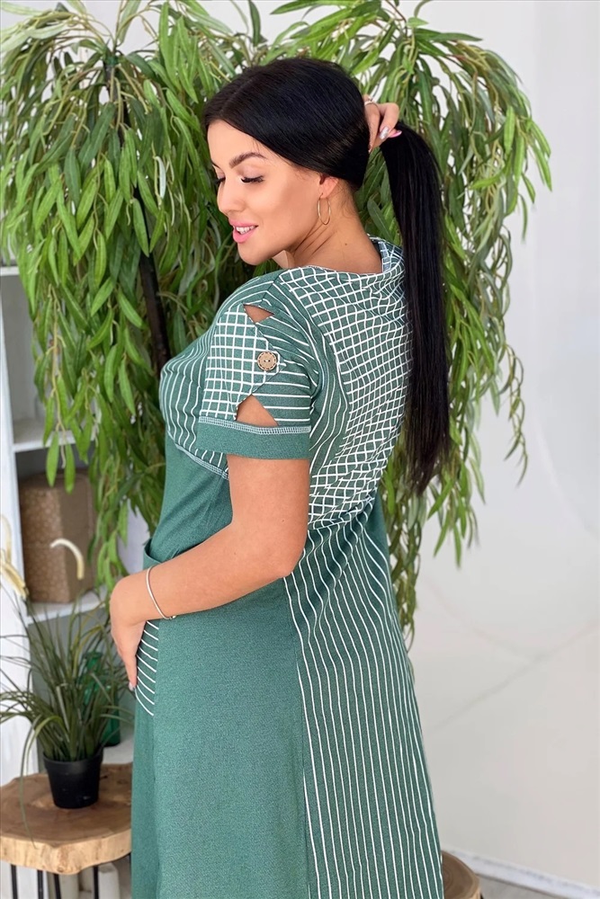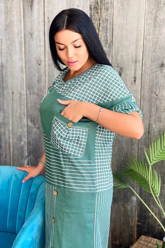 Платье женское прямого силуэта из кулирки. Рукав цельнокроенный с манжетой. В платье удачно сочетаются три вида ткани: однотонная, полоса и клетка. Верхняя часть полочки состоит из трех частей, нижняя - из двух. На средней части полочки два накладных кармана. В боковом шве расположены внутренние карманы. Рельеф в нижней части полочки украшен четырьмя пуговицами, заканчивается разрезом.