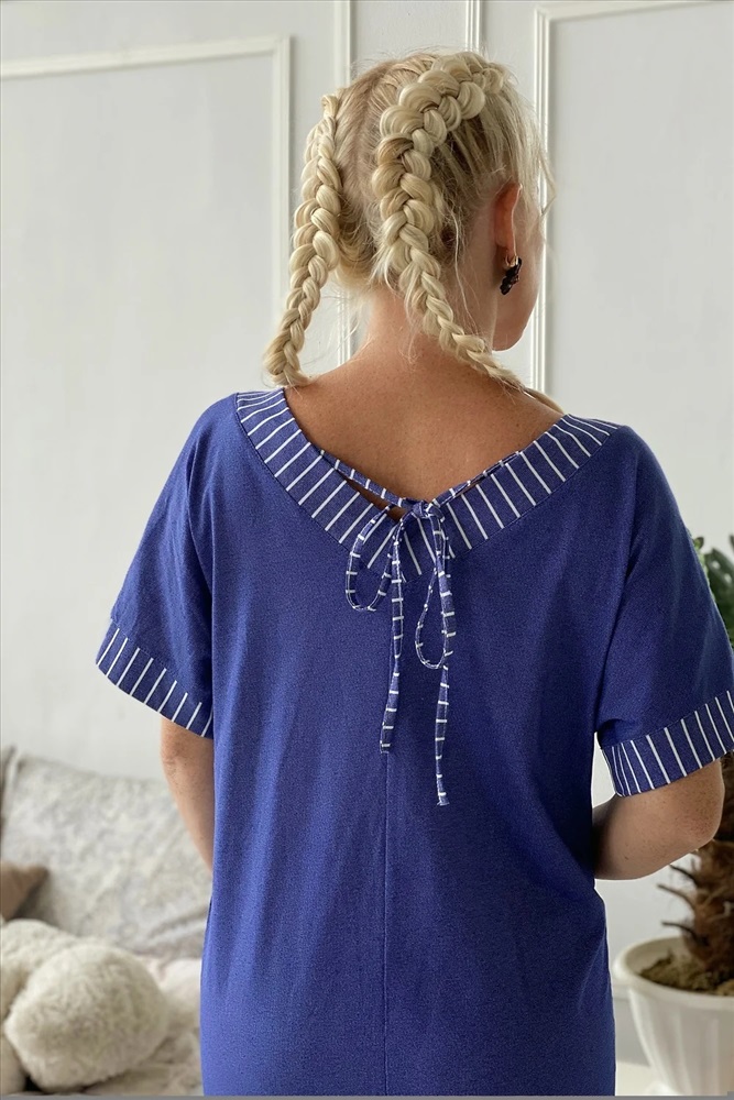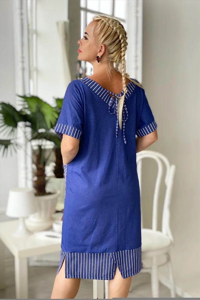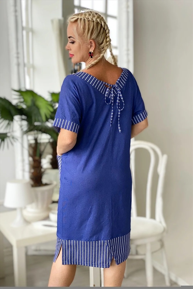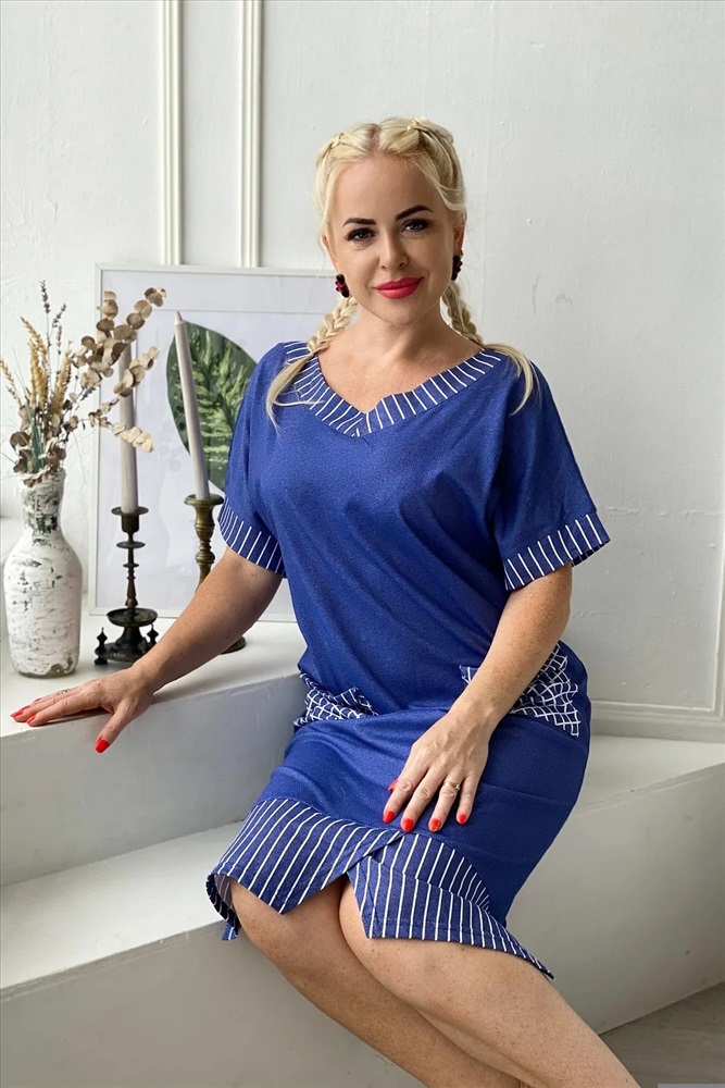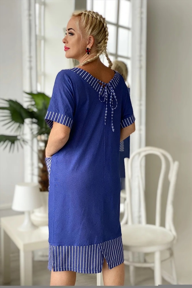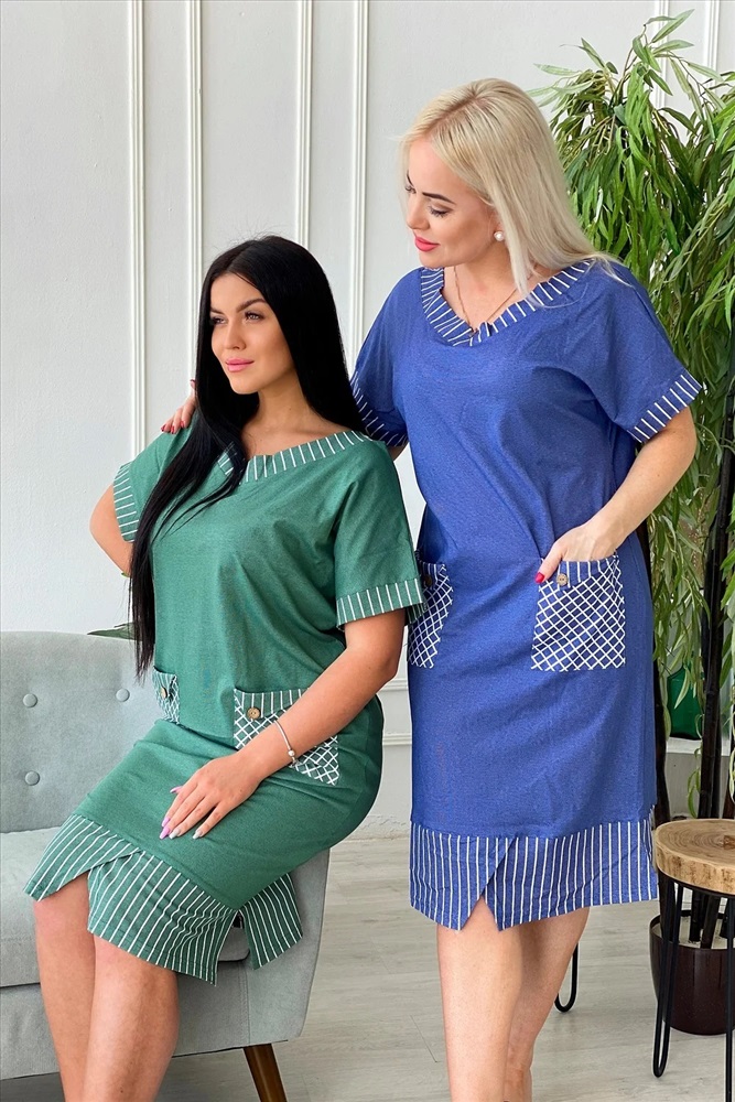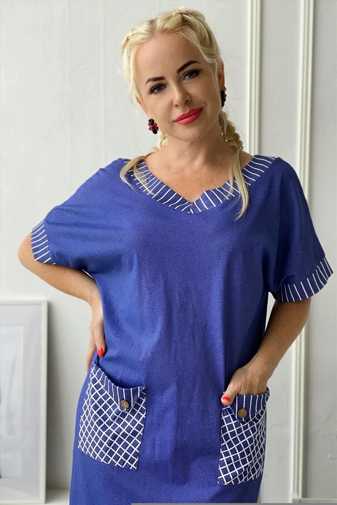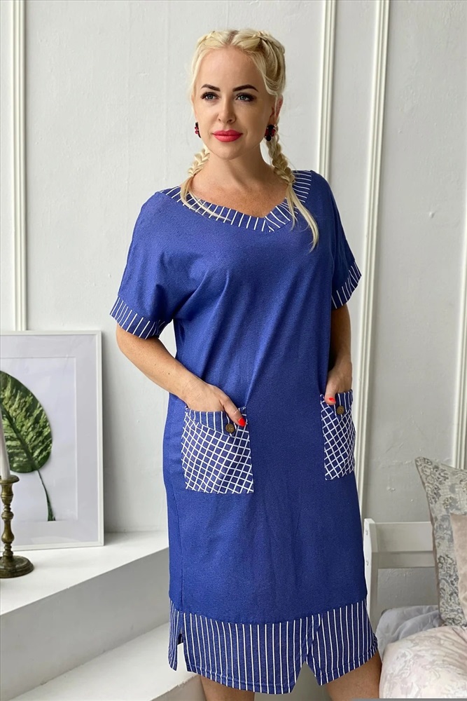 Производитель: Натали; Российский размер: 62; Обхват груди: 124; Обхват талии: 103; Обхват бедер: 130; Артикул поставщика: 7221; Ткань: кулирка; Состав: хлопок 100%; Сезон: Осень, Зима, Весна, Лето; Год: 2024 Платье прямого силуэта с цельнокроенным коротким рукавом на манжете. Вырез горловины спереди и сзади Y-образный. Обтачки горловины, накладных карманов, низ изделия и манжеты рукавов из отделочной ткани в полоску, накладные карманы на полочке в клетку