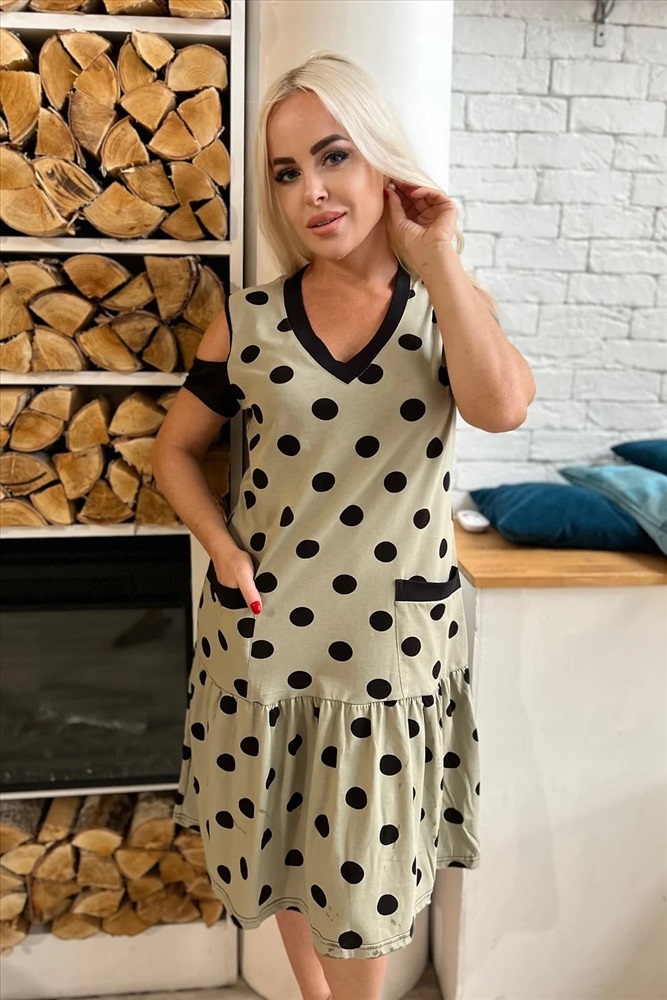 Платье женское полуприлегающего силуэта. Горловина V-образная, рукава с открытым плечом, два боковых кармана, по низу изделия сборка.