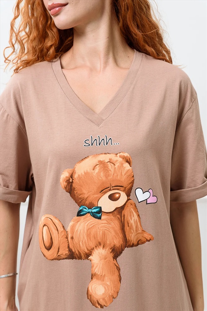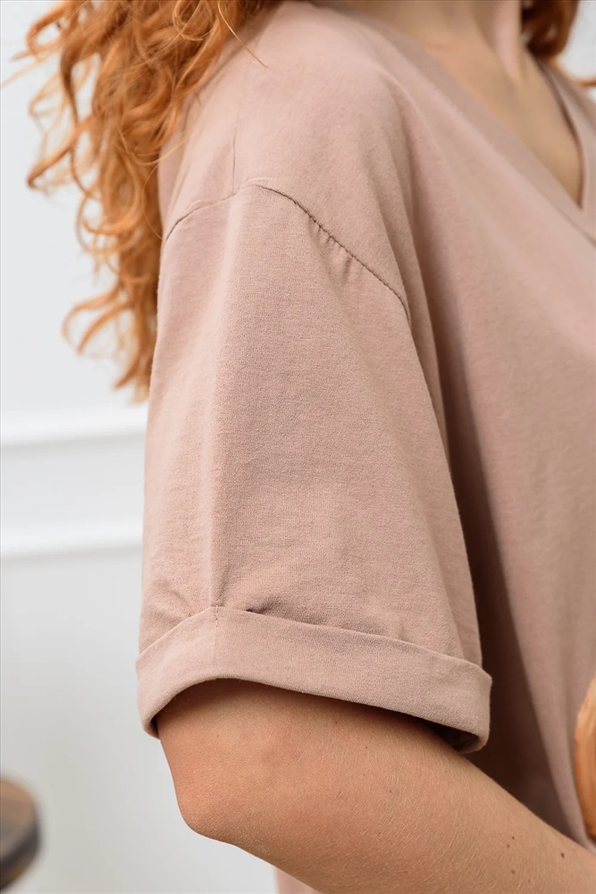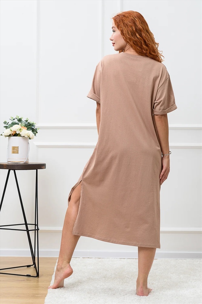Платье в стиле оверсайз. Прямое, свободное, с боковыми карманами, длиной до середины икры, с V-образной горловиной. Рукав короткий, с манжетом. В нижней части боковых швов обработаны разрезы. Горловина обработана обтачкой из основного полотна.