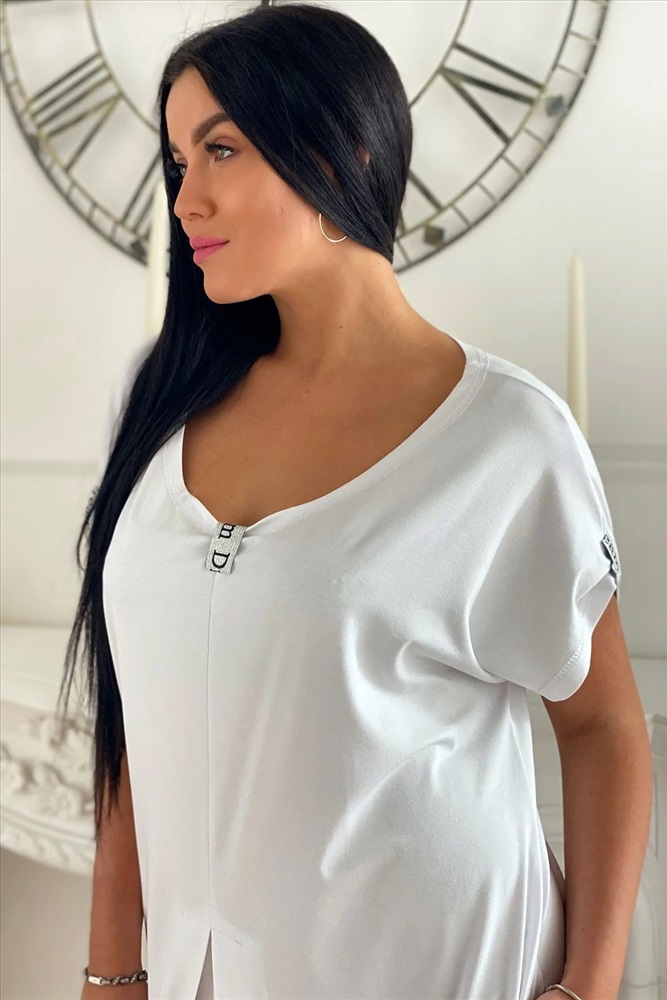 Платье женское прямого силуэта. Рукав цельнокроенный короткий. Середина горловины полочки и низ рукава слегка собран на декоративную серебряную тесьму. От линии талии по центру полочки встречная складка.