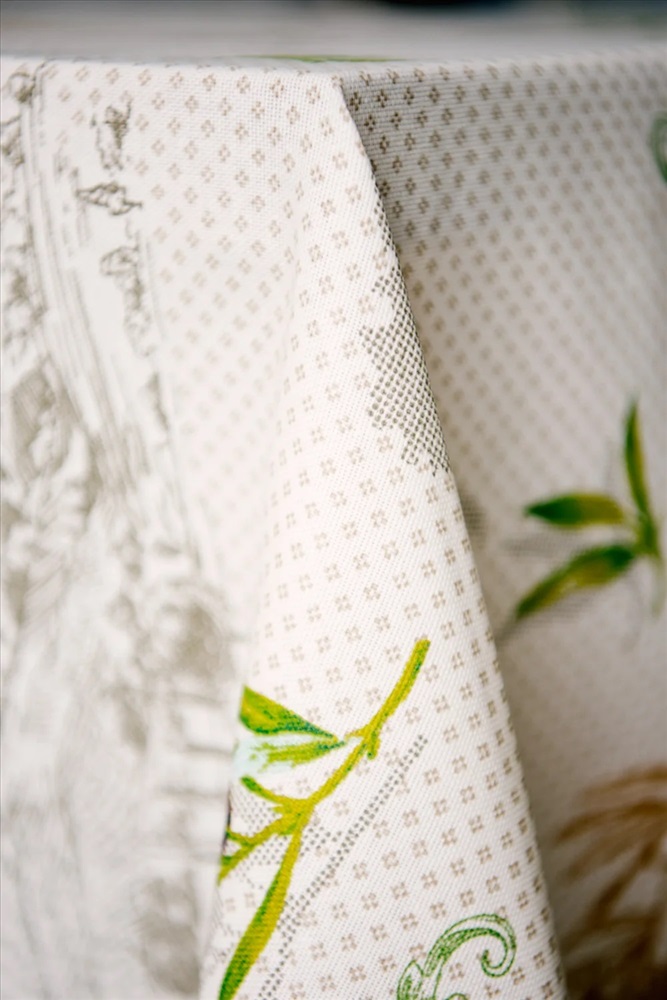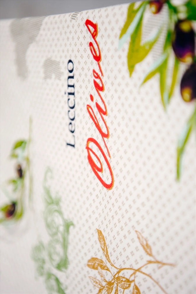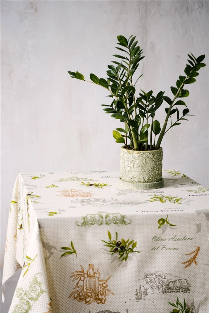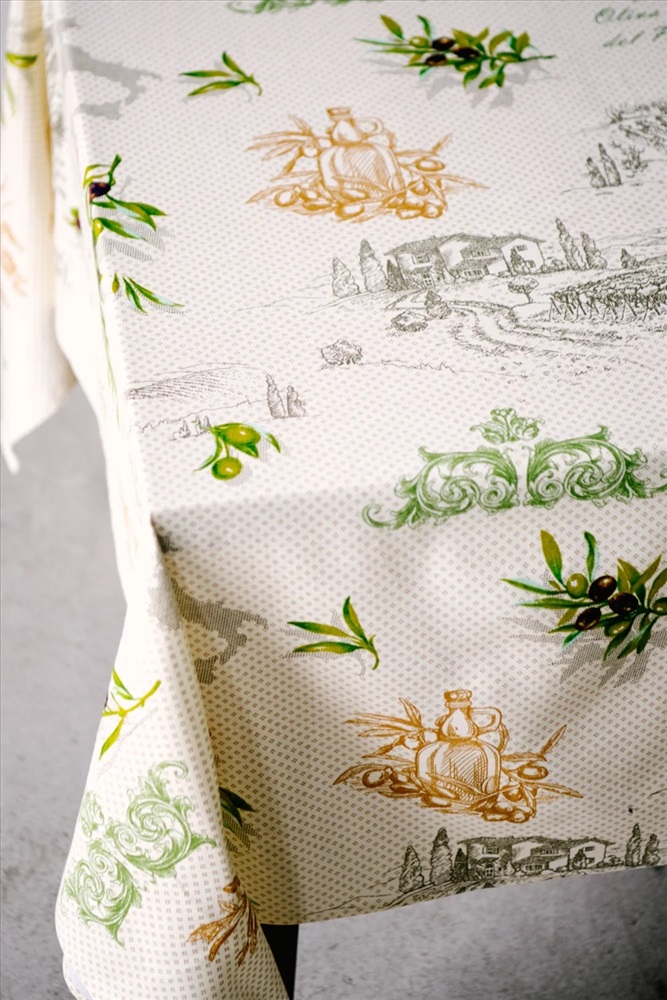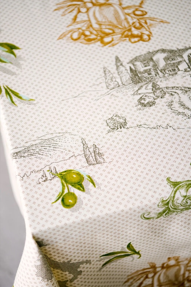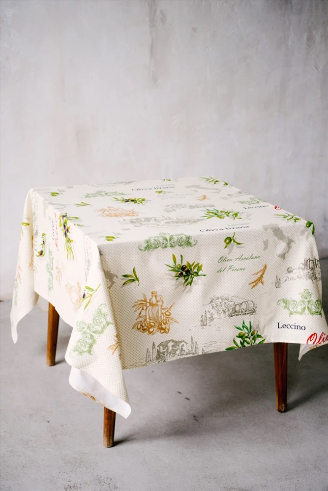 Скатерть из рогожки Олива размером 220*150, с надписями и изображением листьев, оливок и кувшинов.