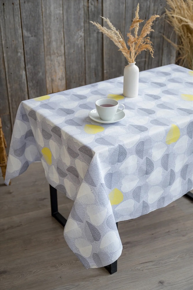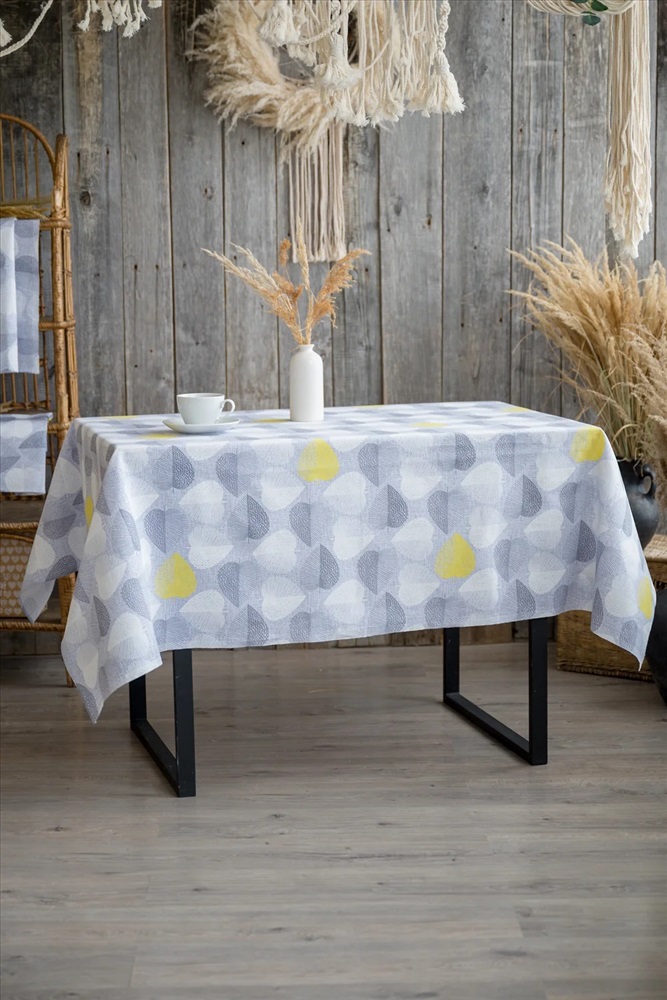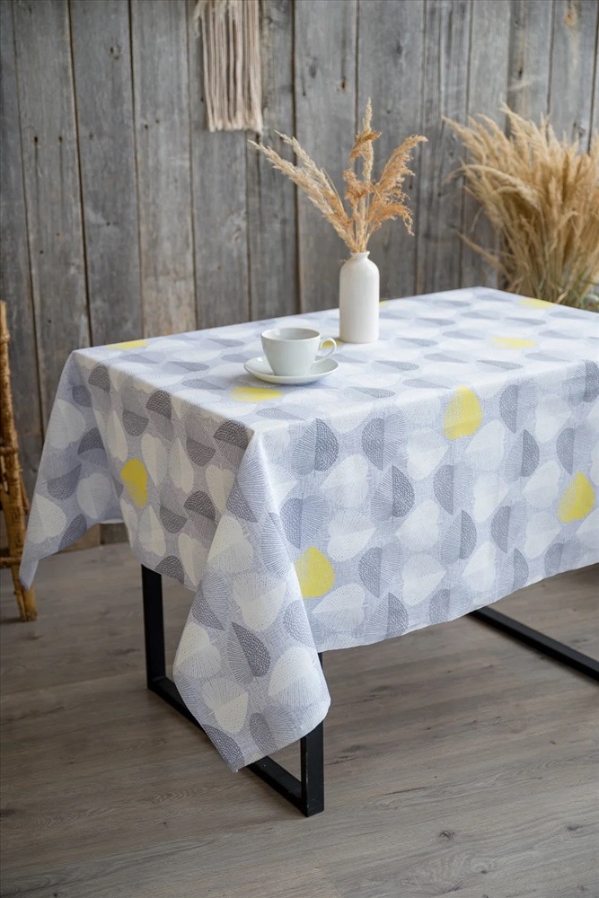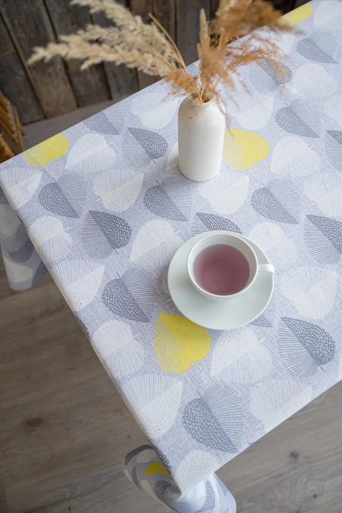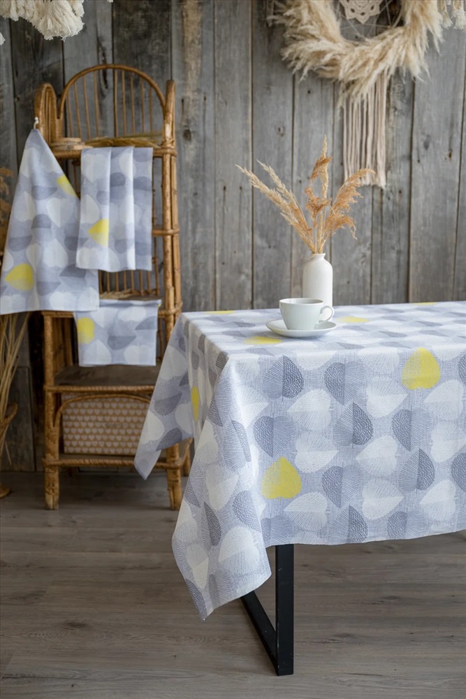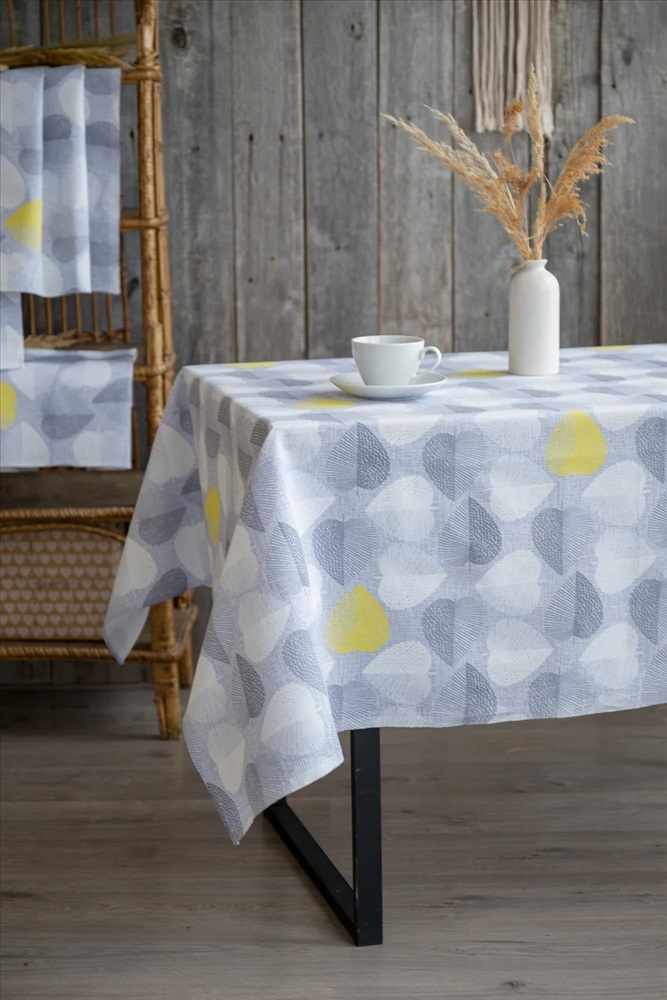 Светлая скатерть из рогожки с повторяющимся узором в виде листьев в форме сердечек способна украсить любой кухонный стол. Скатерть Клинт выполнена преимущественно в серых тонах, а редкие желтые листья добавляют некую изюминку этому дизайну. Благодаря чему изделие выглядит очень гармонично и свежо. Скатерти из рогожки не требуют особого ухода и славятся долгим сроком службы.