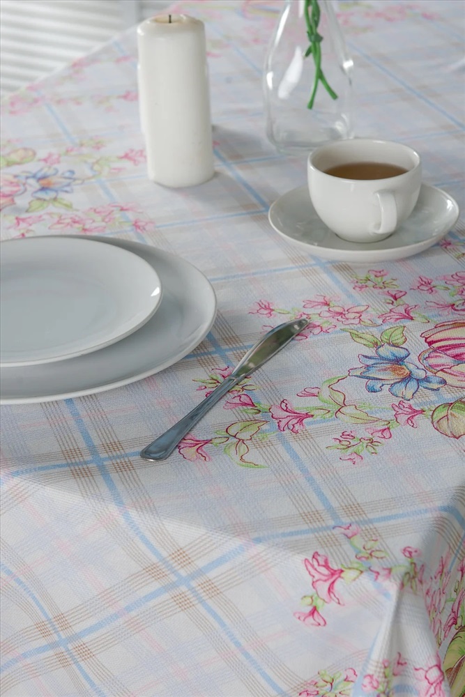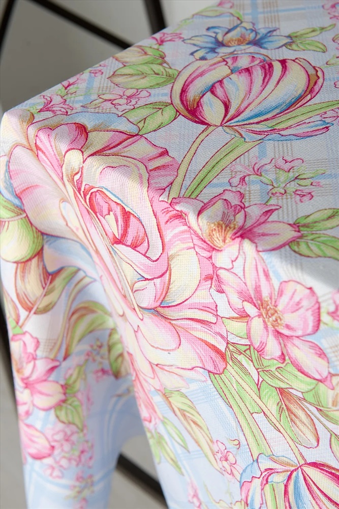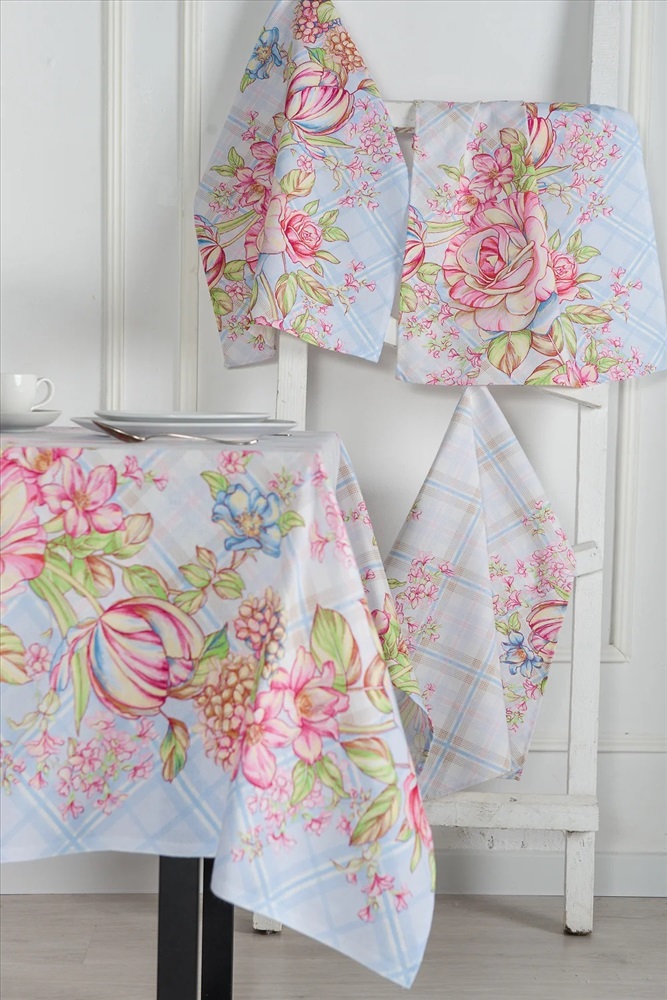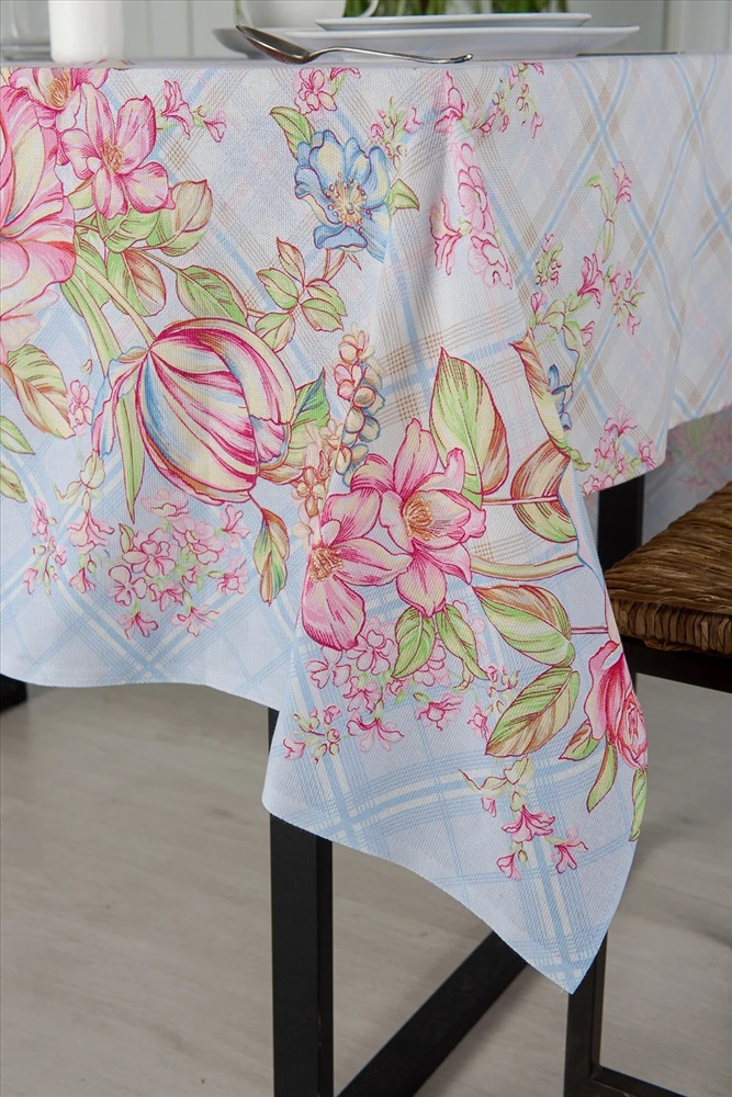 Светлая скатерть из рогожки Весенний букет станет отличным украшением кухонного стола. На полотне нанесен ненавязчивый рисунок, большие и маленькие цветы на розовом и голубом фоне. Благодаря особой износоусточивости и практичности скатерти из рогожки так полюбились многим домохозяйкам. К скатерти так же можно купить набор полотенец Весенний букет оптом и в розницу.