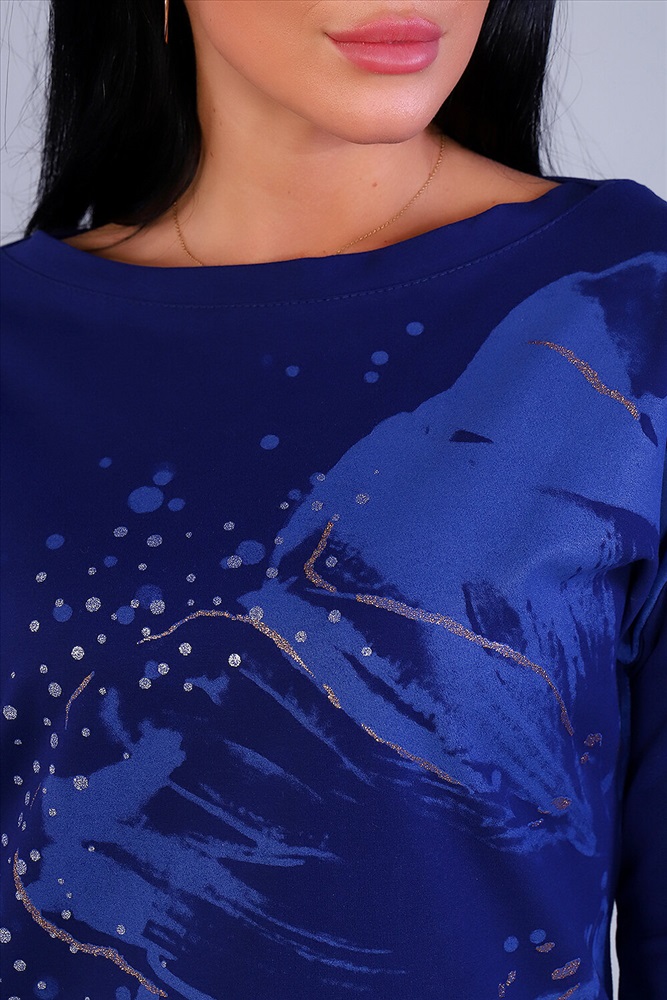 Туника женская с оригинальным принтом в виде большого цветка, из футера с лайкрой 2-х нитки высокого качества пенье. Модель слегка приталенного силуэта, горловина в виде лодочки обработана обтачкой, спущенная пройма, 3/4 рукав. Стильная туника отличный офисный вариант для деловой, современной девушки.
