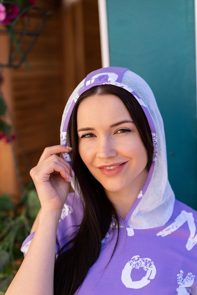 Туника полуприлегающего силуэта, длиной выше колена спереди и удлиненной спинкой, с капюшоном из сетки, с карманами в боковом шве. Рукав короткий, из сетки, с фигурным вырезом. В нижней части боковых швов обработаны разрезы. Лицевой край капюшона, фигурные вырезы и низ рукавов обработаны бейкой из основного полотна.