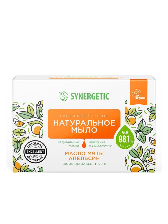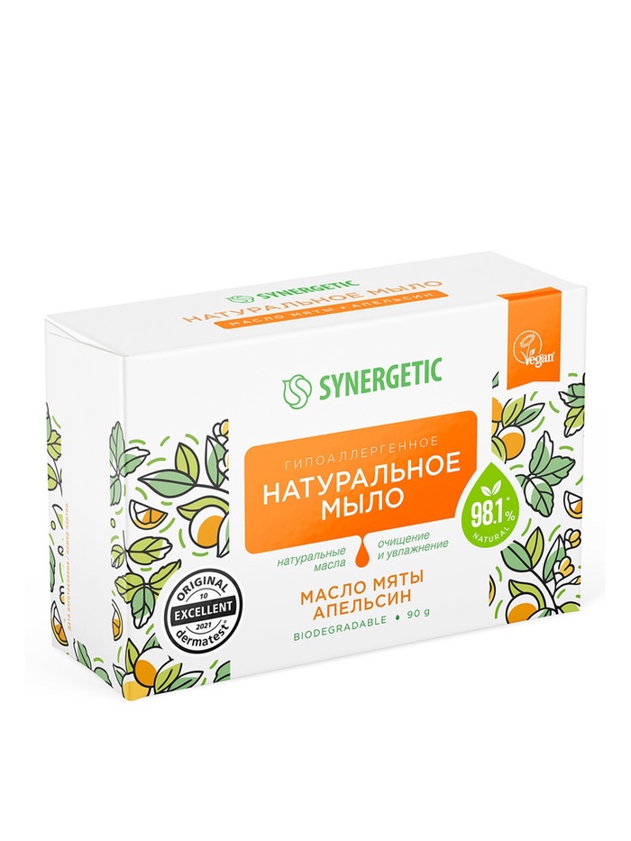 Натуральное кусковое туалетное мыло SYNERGETIC "Масло мяты и апельсин" - средство для мягкого очищения и ухода за кожей, более чем на 99% состоящее из натуральных компонентов. Мыло имеет натуральную основу, изготовленную из растительных масел, которые бережно воздействуют на кожу, предохраняя от пересушивания при частом мытье рук. Натуральные эфирные масла и экстракты оказывают дополнительный уход и восстановление, а зелёные хелаты не наносят вред окружающей среде. Пантенол - незаменимый по эффективности компонент для защиты сухой и чувствительной кожи, он усиливает действие увлажняющих компонентов и способствует восстановлению барьерных функций. Парфюмерная композиция на основе натуральных эфирных масел эвкалипта, апельсина и перечной мяты оставляет на коже потрясающий аромат. Нанести на влажную кожу, вспенить и смыть водой. Только для наружного применения. Беречь от детей. При попадании средства в глаза промыть водой. Использовать строго по назначению. Aqua, Sodium Cocoamphoacetate (мягкий ПАВ), Cocamidopropyl Betaine (мягкий ПАВ), Glycerin (растительный увлажнитель), Caprylyl/Capryl Glucoside (мягкий ПАВ), Candida Bombicola/Glucose/Methyl Rapeseedate Ferment (софоролипиды рапсового масла), Aloe Barbadensis Leaf Juice (сок алоэ), Vitis Vinifera Seed Extract (экстракт виноградной косточки), Sweet Almond Oil Polyglyceryl-4 Esters (масло миндаля), Sodium Hyaluronate (гиалуроновая кислота), Saccharide Isomerate (растительный увлажнитель), Trehalose (натуральный полисахарид, пребиотик), Lactic Acid (молочная кислота), Parfum, Dehydroacetic Acid, Benzyl Alcohol, Benzoic Acid, Sodium Benzoate, Potassium Sorbate (консерванты), Citric Acid, Sodium Citrate (регуляторы кислотности).