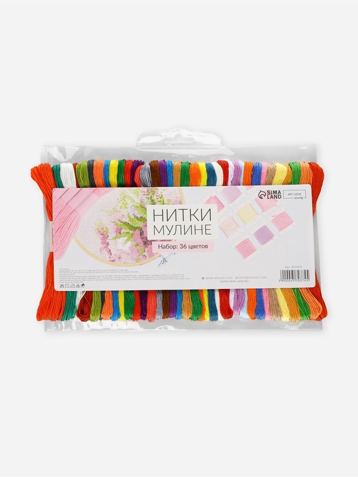 Набор ниток мулине (ТМ «Арт Узор»), 36 шт, номера цветов: 817, 3865, 3842, 307, 740, 910, 437, 3843, 3837, 433, 318, 892, 550, 606, 699, 973, 995, 3340, 413, 581, 919, Blank, 3812, 608, 720, 722, 702, 977, 727, 3864, 604, 798, 971, 3761, 209, B5200.