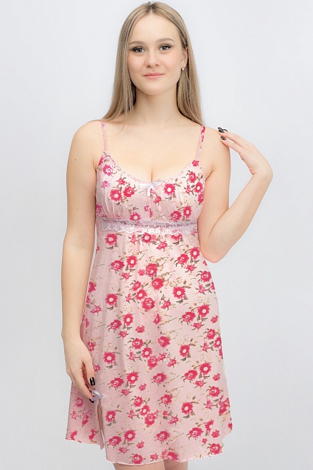 Сорочка из мягкого трикотажного полотна, средней длины и достаточно свободного силуэта. Модель с завышенной линией талии, которая подчеркнута тонкой кружевной тесьмой.