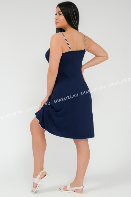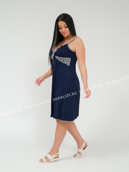 Нарядный сарафан темно-синего цвета с контрастной вставкой в виде банта выгодно подчеркивает грудь. Выполнен он из легкой, струящейся, приятной на ощупь вискозы с добавлением лайкры. Изделие полуприлегающего силуэта, с длиной немного выше колен станет идеальной базой на лето, обеспечивает свободную посадку на бедрах.