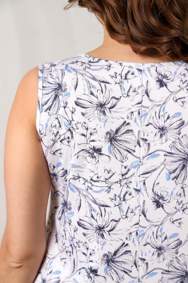 Сорочка женская из трикотажного полотна «кулирка» с набивным рисунком, расширенная книзу, с короткими рукавами покроя «реглан», состоящими из двух частей, одна из которых присборена, с горловиной V- образной формы, окантованной основным материалом. Нижний срез рукавов обработан кружевом.
