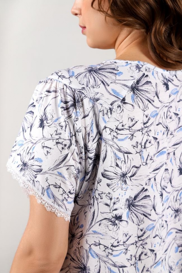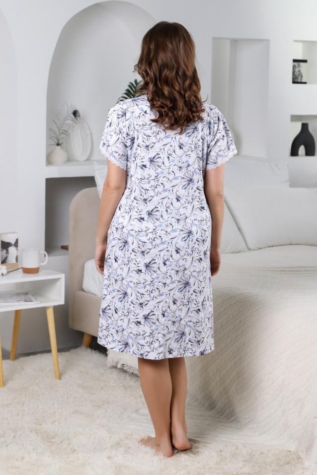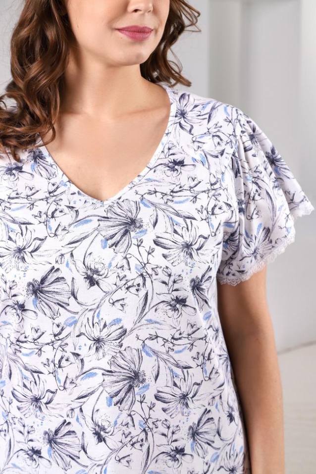 Сорочка женская из набивного трикотажного полотна «кулирка», расширенная книзу, без рукавов, с углубленной горловиной овальной формы, украшенной декоративными пуговицами на встречной складке в центре полочки, идущей из горловины. Горловина и проймы окантованы отделочным материалом. Комментарии к товару