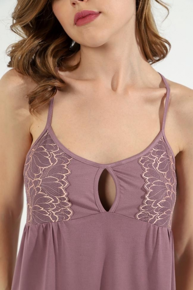 Сорочка молодежная из гладкокрашеного трикотажного вискозного полотна,расширенная книзу, на узких бретелях. Полочка – с лифом «бюстье», отделанным кружевом, в центре лифа – разрез, окантованный основным материалом. Основная деталь переда присборена по шву соединения с лифом. Верхний срез спинки и проймы окантованы основным материалом, бретели вытачаны из окантовки.