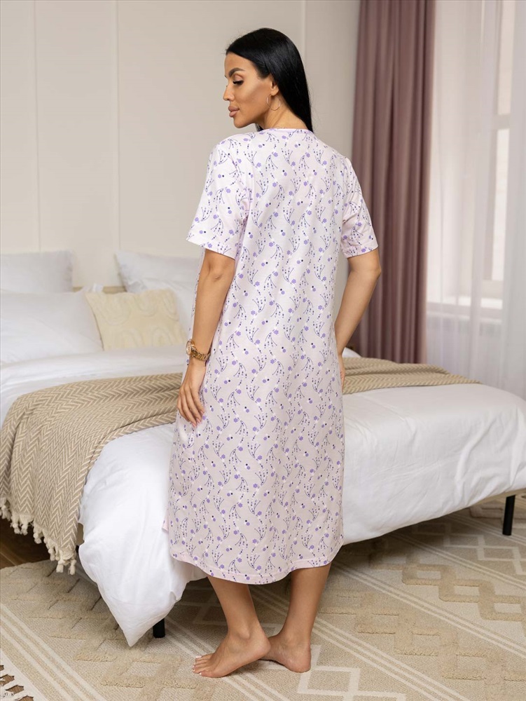 Ночная сорочка женская из трикотажного полотна - кулирка, прямого силуэта, с притачной кокеткой по верху переда, со складками по линии соединения кокетки и полочки, поверх шва соединения кокетки и полочки нашита декоративная тесьма с ромашками. Вырез горловины О-образный и обработан окантовкой. Рукав втачной, базового покроя, короткий.