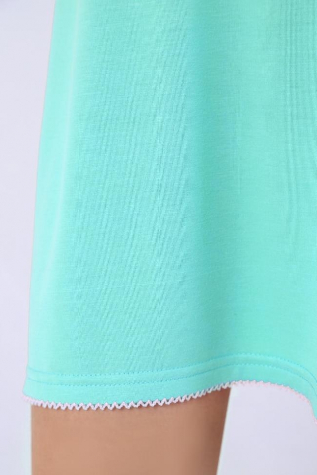Сорочка - молодежная из трикотажного гладкокрашеного трикотажного полотна «джерси», свободного покроя, слегка расширенная книзу, без рукавов, с V-образным вырезом горловины переда и спинки. Горловина окантована основным материалом и дополнительно украшена декоративной строчкой «кроше» нитками контрастного цвета. На спинке - декоративный элемент в виде перекрещенных между собой бретелей. Проймы окантованы основным материалом. Комментарии к товару
