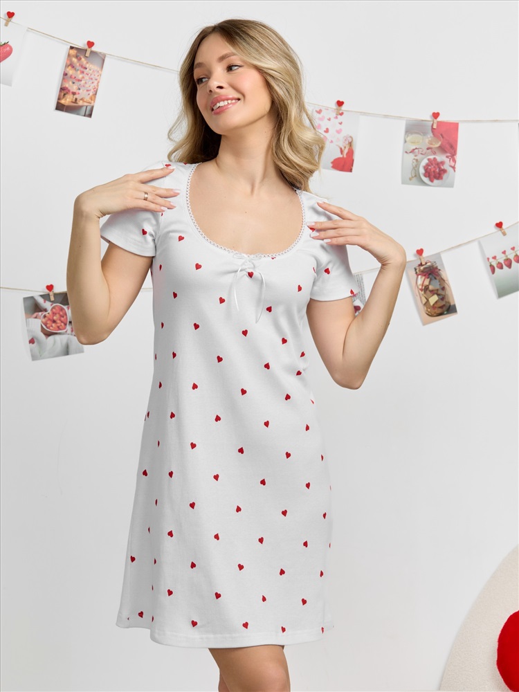 Сорочка женская из трикотажного полотна «кашкорсе» с набивным рисунком, полуприталенного силуэта, с короткими втачными рукавами, углубленной формой горловины, по центру которой выполнена небольшая сборка. Низ изделия и нижние срезы рукавов обработаны подгибкой, срез горловины - эластичной тесьмой с фасонным краем, в центре настрочен узкий декоративный бантик.