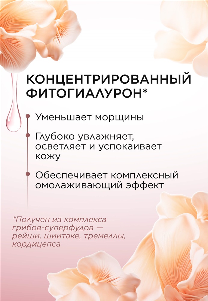 Концентрированный фитогиалурон стимулирует синтез коллагена и эластина, осветляет кожу, глубоко увлажняет и успокаивает ее. Получен из комплекса грибов-суперфудов (рейши, шиитаки, тремеллы, кордицепса) и содержит полисахариды, тритерпены, полифенолы, эрготионеин и койевую кислоту, за счет чего обеспечивает комплексный омолаживающий эффект и заметно улучшает состояние кожи. Масло ши обеспечивает глубокое питание кожи и ускоряет процессы регенерации.