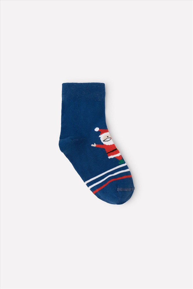 Новогодние трикотажные носки обычной длины с формованной пяткой. Украшены рисунком с Дедом Морозом. Эластичная резинка по верхнему краю.