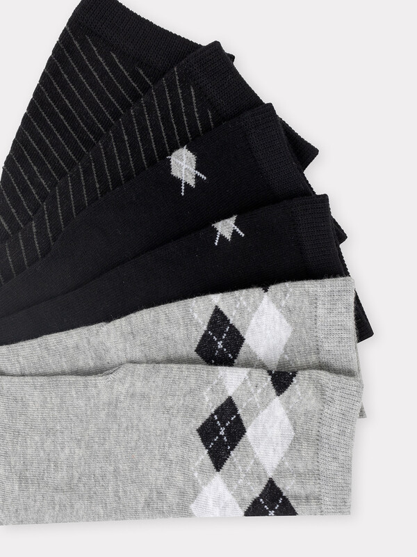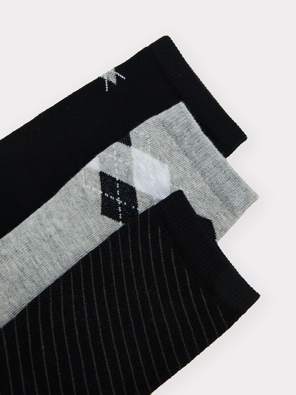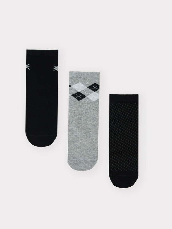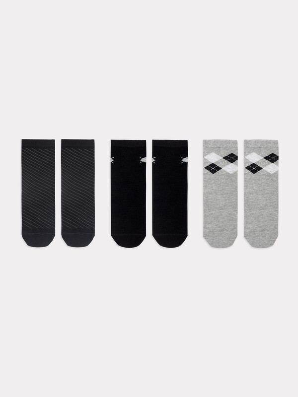 Мультипак из трех пар гладких детских носков с рисунком в виде ромбов и диагональной полоски.