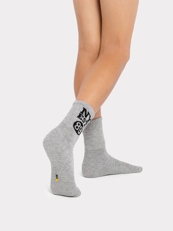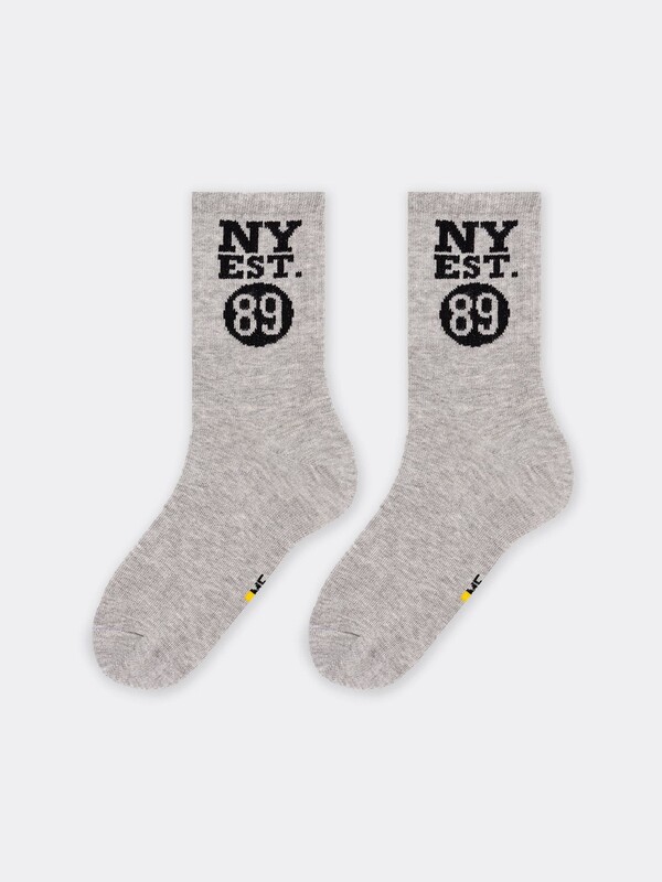 Носки детские из высококачественного хлопка с рисунком в виде надписи "NY EST.89". Натуральные волокна отлично пропускают воздух и впитывают влагу, дарят ощущение комфорта в течение дня. Благодаря небольшому количеству эластана в составе, носки удобно сидят на ножке и не сползают, хорошо тянутся и легко надеваются. Пятка и мысок дополнительно укреплены для защиты от протирания. Резинка мягко, но надежно удерживает носки, не оставляя на коже следов. Эти детские носки точно понравятся вашей маленькой моднице. Рекомендуем!