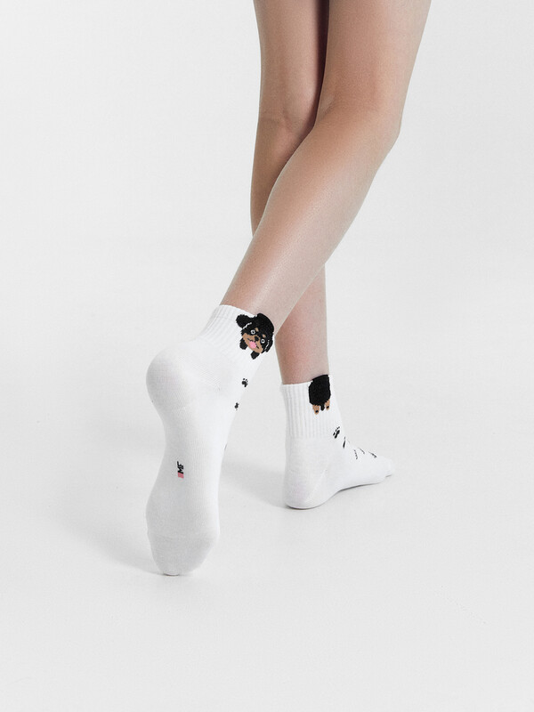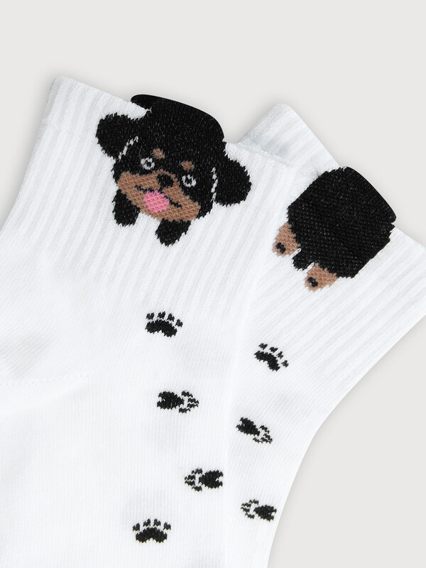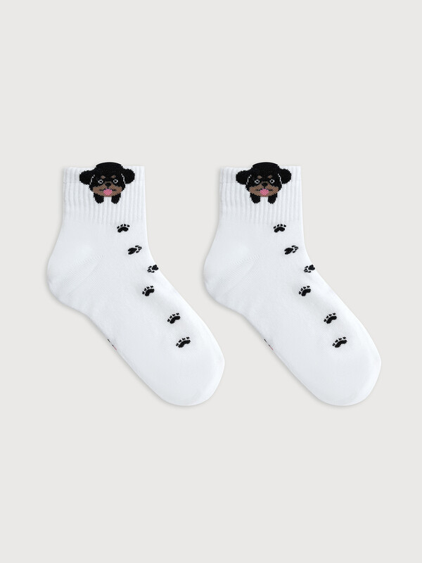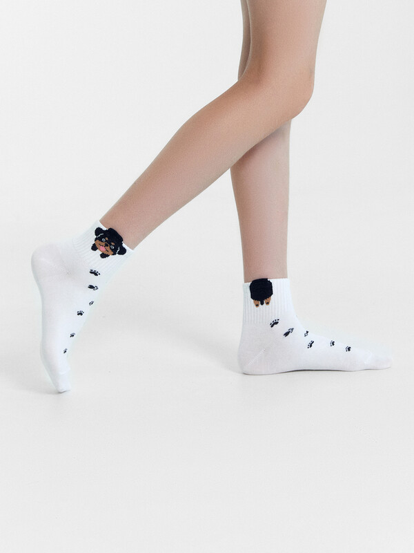 рис.2783 Гладкий детский носок с резинкой, средней высоты и объёмным рисунком в виде собаки.