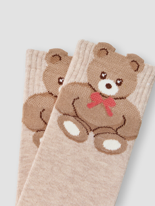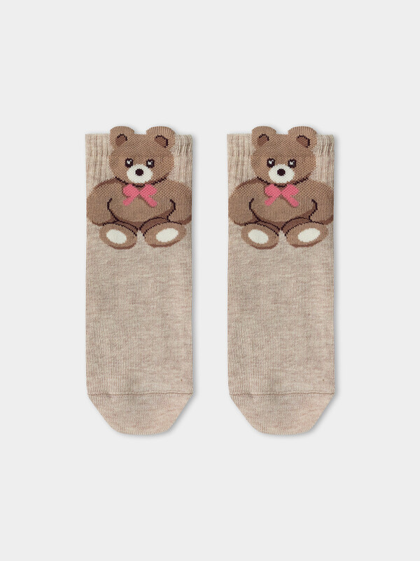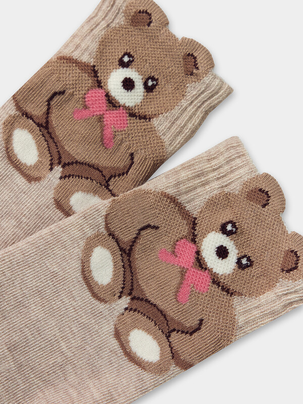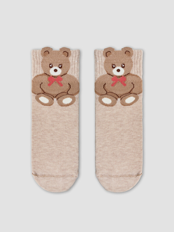 рис.2793 Гладкий детский носок с резинкой, средней высоты и объемным рисунком в виде медведя.
