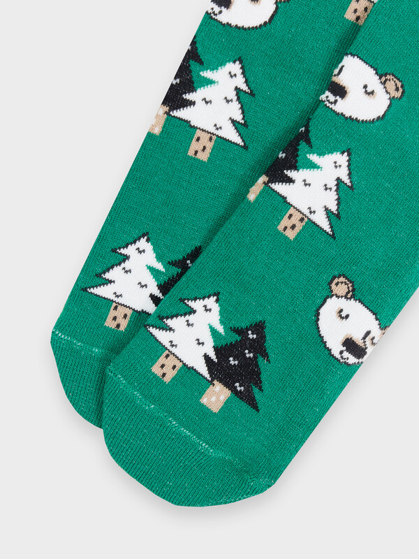 рис.2136 Детский носок с плюшевым следом и рисунком в виде елок и медведей.