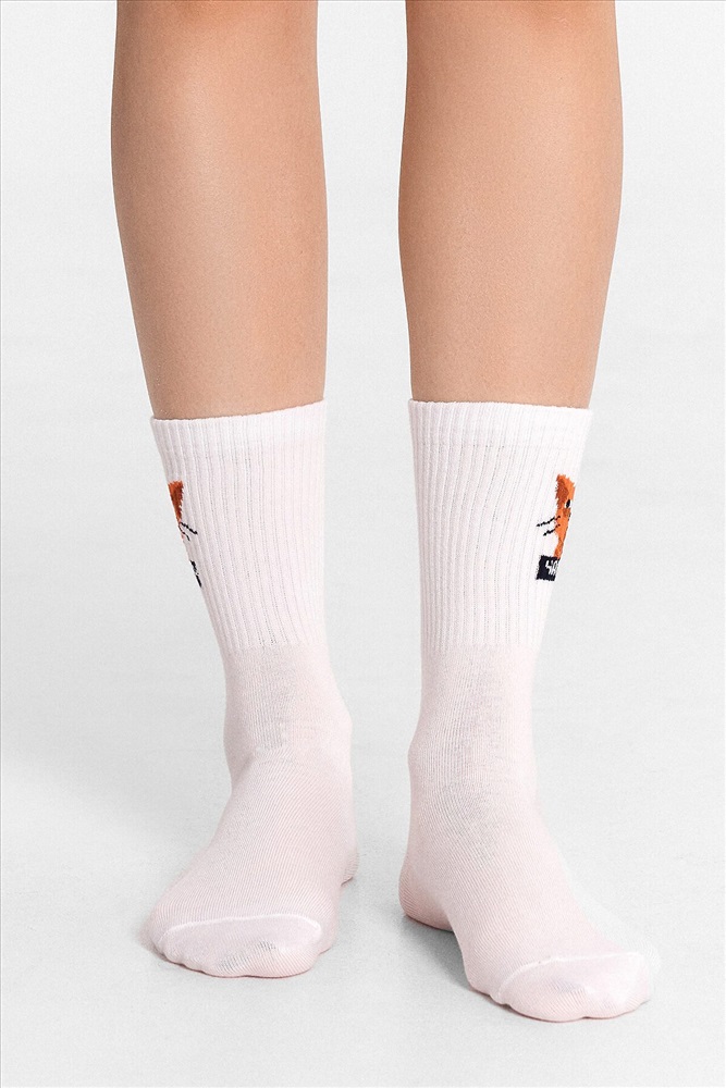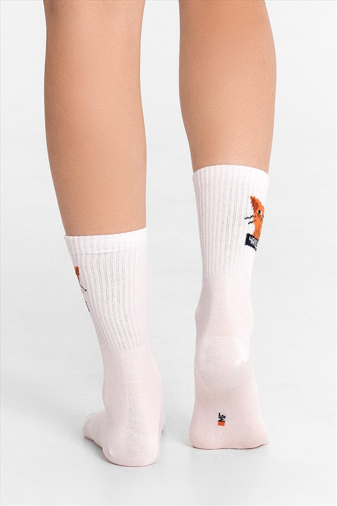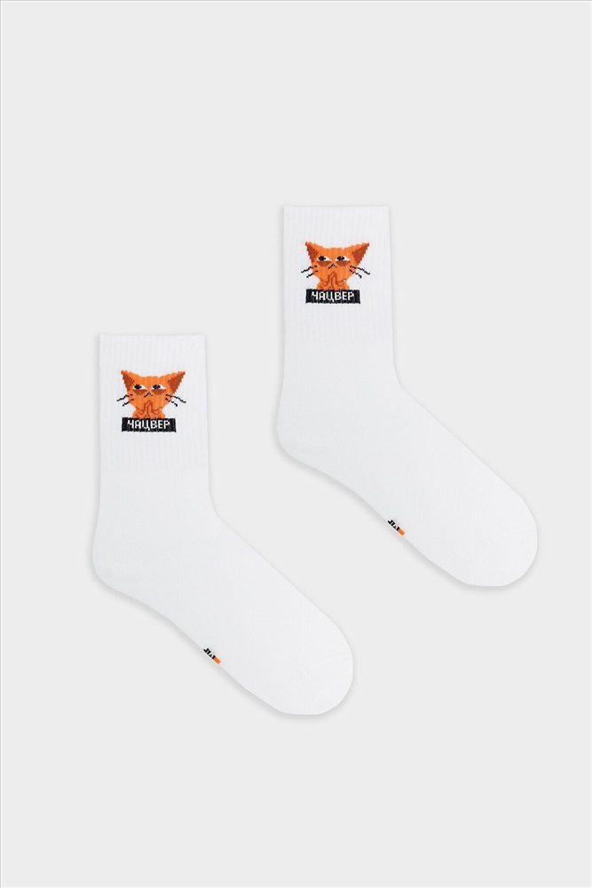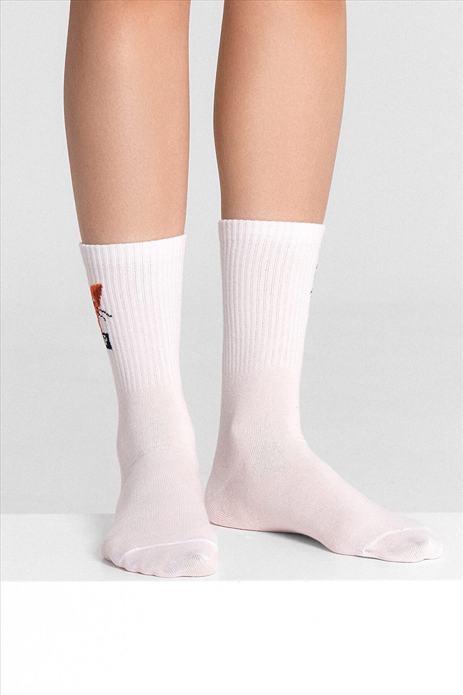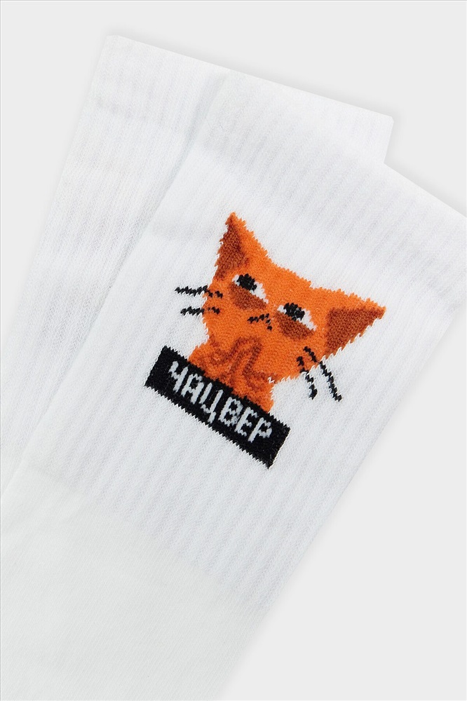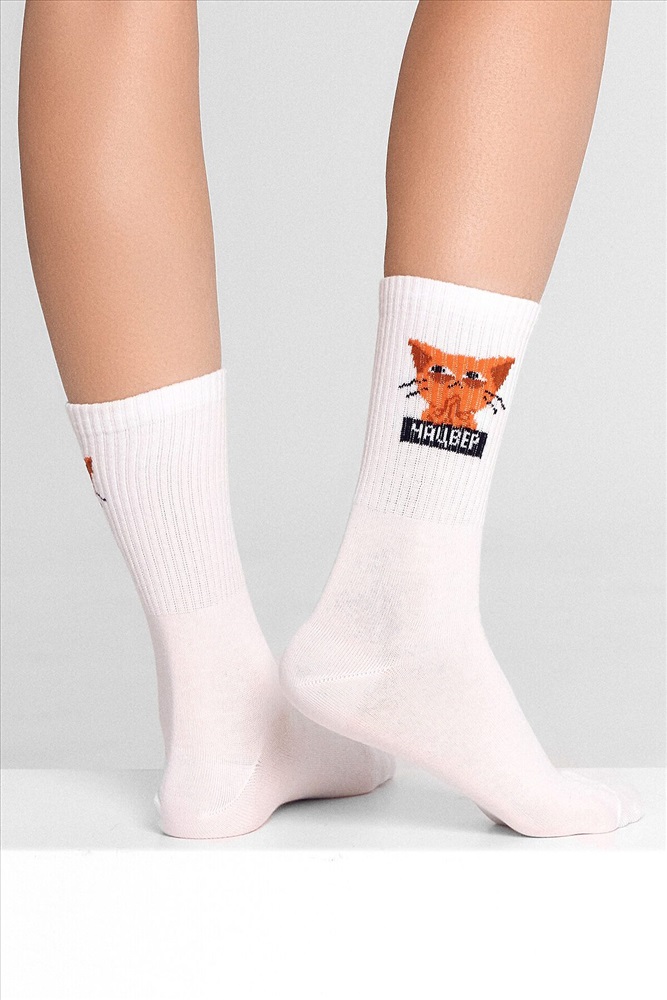 рис.2667 Женский носок с высоким плотным бортом и рисунком в виде котика с надписью.