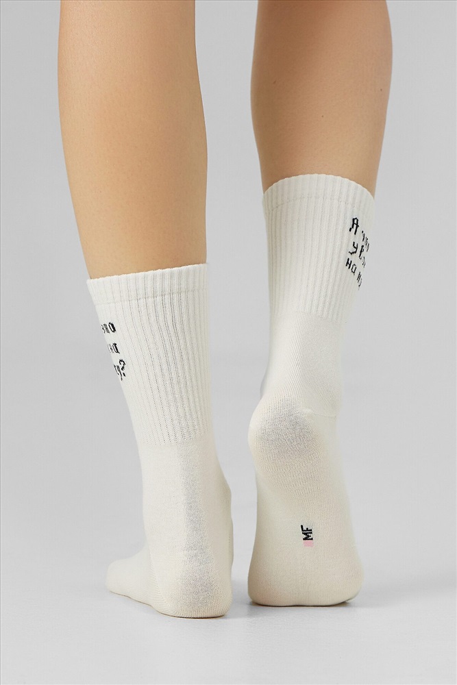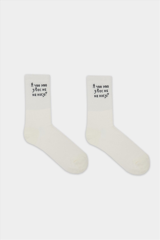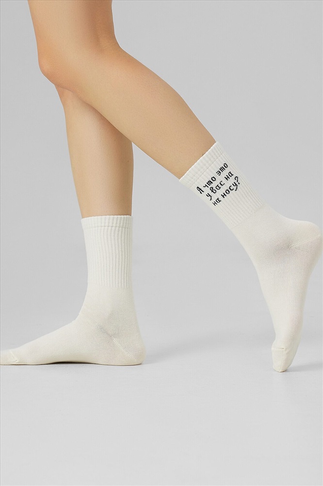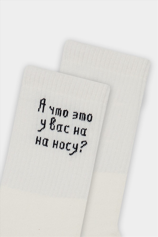 ID товара: 1192244 Состав: 68% Хлопок; 27% Полиамид; 5% Эластан Сезон: Демисезон Основная ткань: Хлопок Вид носков/гольф: Фантазийные Страна бренда: Беларусь Страна производства: Беларусь рис.3331 Женские носки высокие с плотным бортом и рисунком в виде надписи "А что это у вас на носу?" на участке резинки. Комментарии к товару