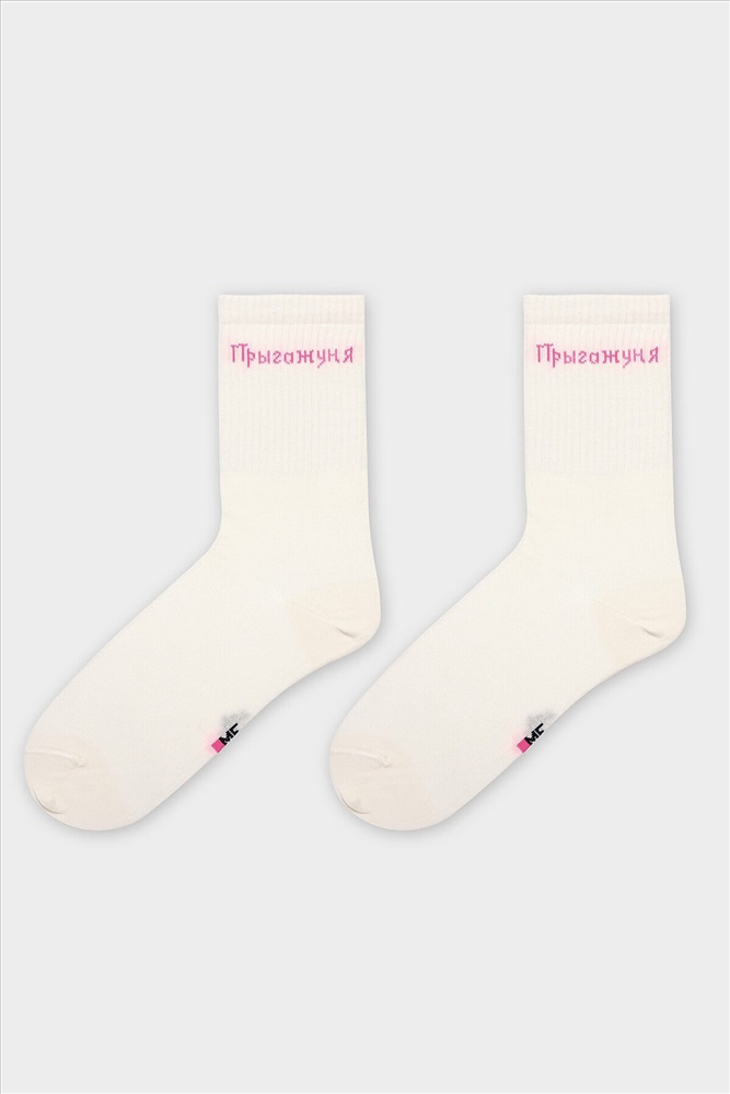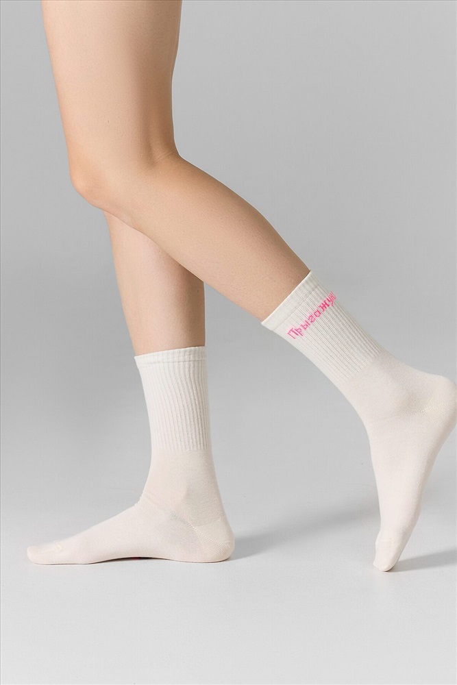 ID товара: 1195697 Состав: 68% Хлопок; 27% Полиамид; 5% Эластан Сезон: Демисезон Основная ткань: Хлопок Вид носков/гольф: Фантазийные Страна бренда: Беларусь Страна производства: Беларусь рис.3332 Женские носки высокие с плотным бортом и рисунком в виде надписи "Прыгажуня". Комментарии к товару