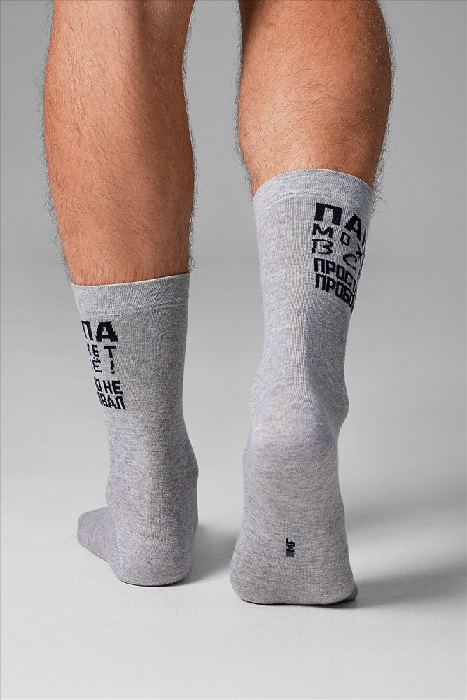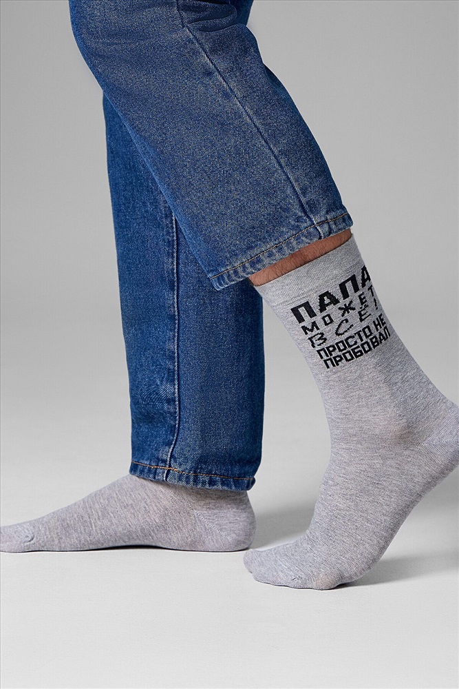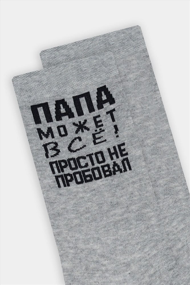 ID товара: 1200417 Состав: 75% Хлопок; 23% Полиамид; 2% Эластан Сезон: Демисезон Основная ткань: Хлопок Вид носков/гольф: Фантазийные Страна бренда: Беларусь Страна производства: Беларусь рис.2260 Мужской носок классический высокий с рисунком в виде надписи "Папа может все!Просто не пробовал". Комментарии к товару
