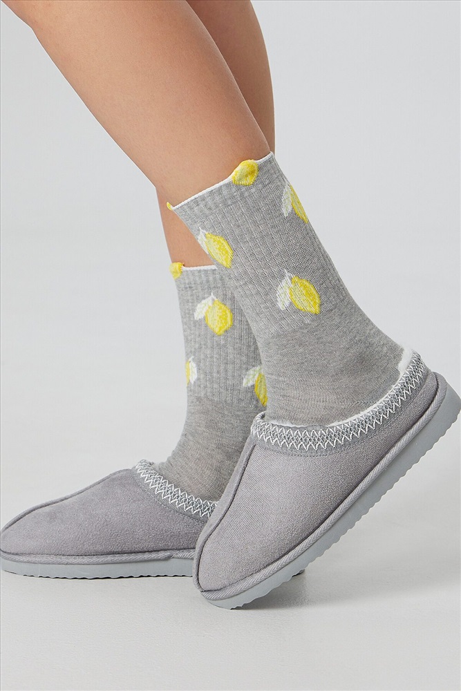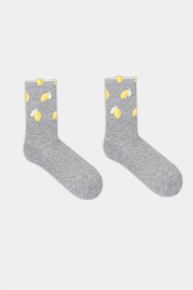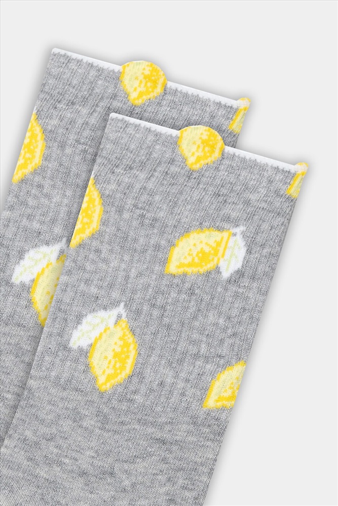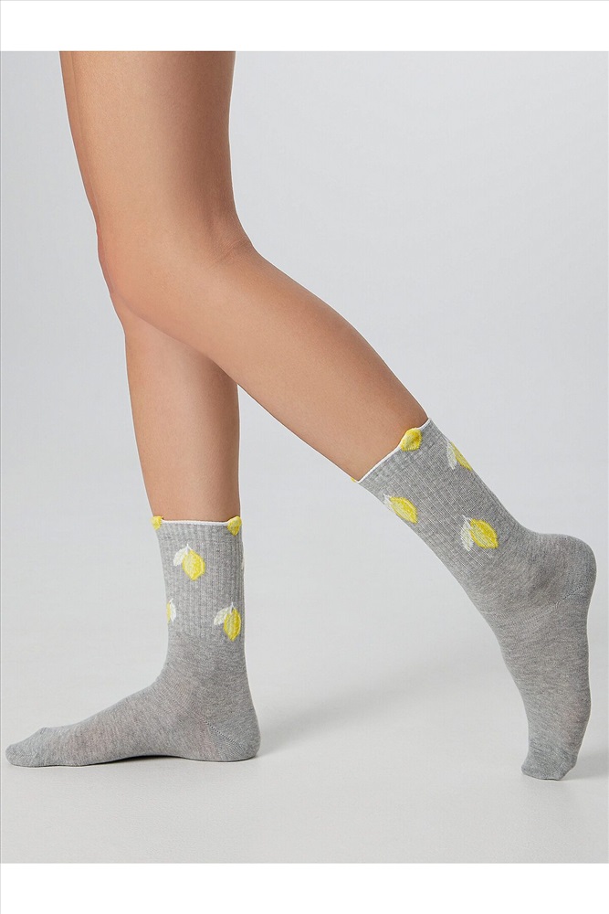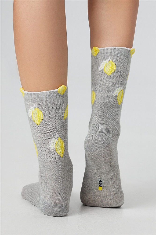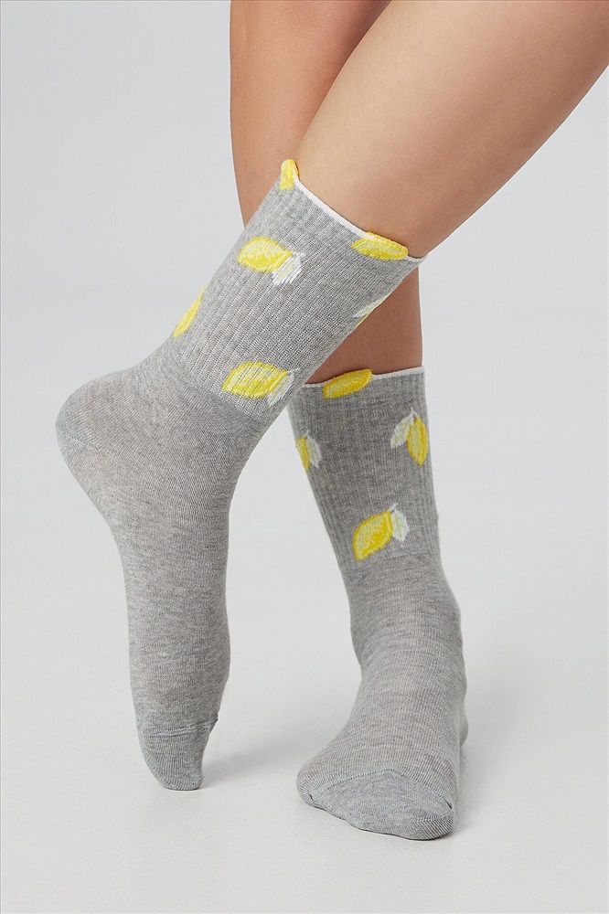 Модель выполнена из комбинированных материалов, которые обеспечивают воздухопроницаемость, эластичность и комфорт. Универсальный белый фон легко сочетается с любой обувью — от кроссовок до ботинок, а солнечные лимоны поднимают настроение и добавляют образу игривости.