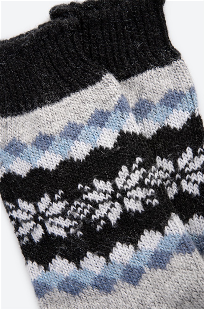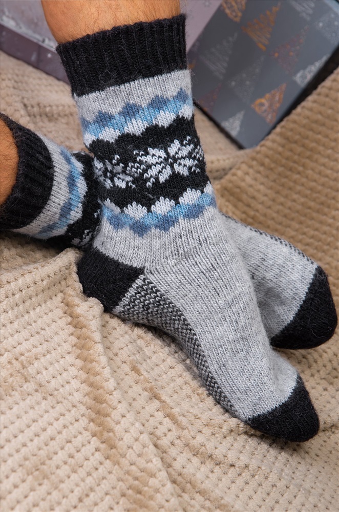 Мужские носки выполнены из мягкой и приятной к телу шерстяной пряжи. Классическая высота и спокойная черно-серая палитра с красивым орнаментом делают вязаные носки стильным и практичным аксессуаром для холодной осени и зимы.
