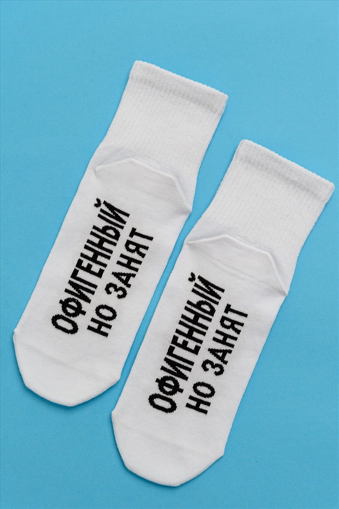 ID товара: 979175 Состав: 77% Хлопок, 21% Полиамид, 2% Эластан Сезон: Весна/Лето Рисунок: Надпись Основная ткань: Хлопок Вид носков/гольф: Фантазийные Вид ткани: Чулочно-носочный трикотаж Страна бренда: Россия Страна производства: Россия Мужские носки в комплекте 1 пара. Широкая резинка по всей верхней части носка. Надпись на стопе Офигенный, но занят Комментарии к товару