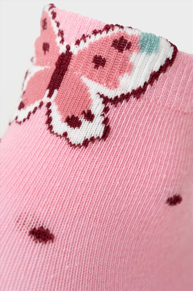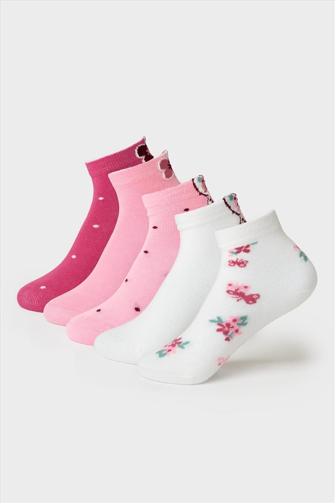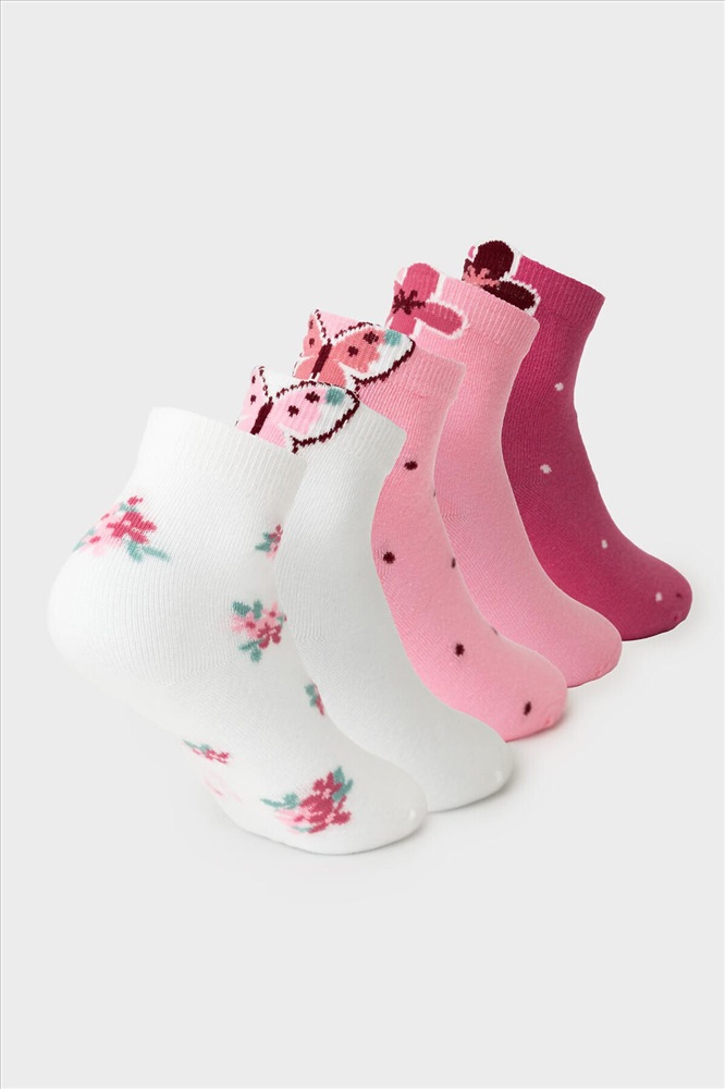 ID товара: 1239795 Состав: 75% хлопок, 20% нейлон, 5% эластан Сезон: Весна/Лето Набор из пяти пар детских носков для девочки. У каждой пары — свой рисунок: бабочка, цветы, узоры. На подошве расположены прозрачные силиконовые стопперы, которые предотвращают скольжение. Размерная маркировка также выполнена жаккардом на стопе. Материал — мягкий хлопковый трикотаж. Комментарии к товару