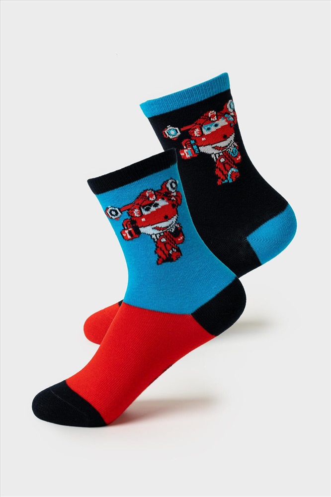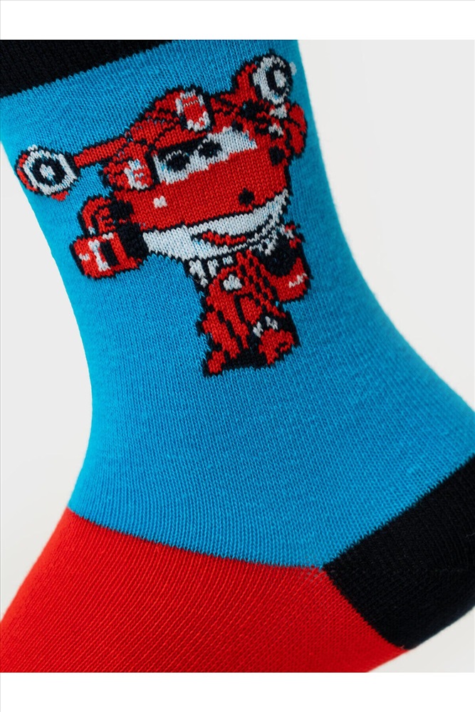 Набор из трех пар детских носков с яркими принтами персонажей Super Wings для мальчика. Удобная резинка не сдавливает ногу, а на стопе — аккуратная жаккардовая надпись с размером. Материал — мягкий хлопковый трикотаж.