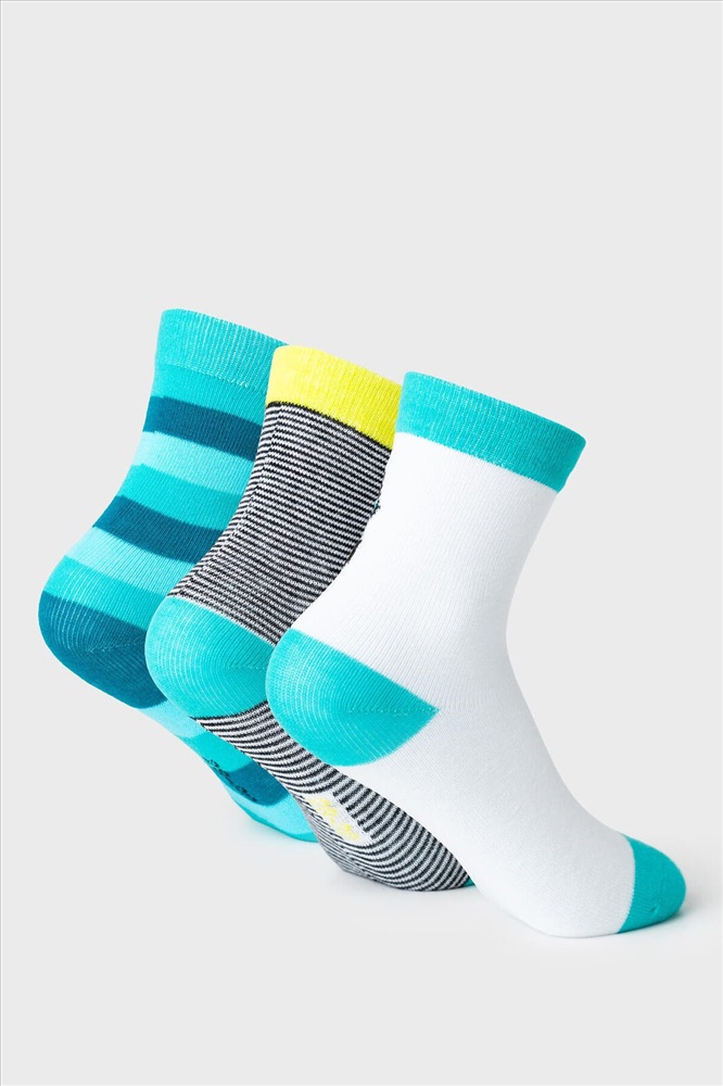 Набор из трех пар детских носков для мальчика. В комплект входят модели с полосками, однотонные и с принтом. Удобная резинка не сдавливает ногу, а на стопе — аккуратная жаккардовая надпись с размером. Материал — мягкий хлопковый трикотаж.