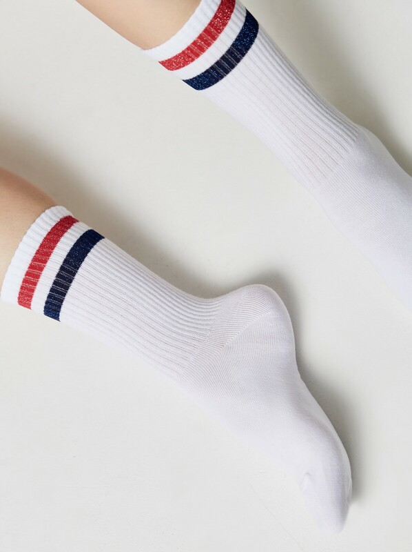 Хлопковые носки с яркими полосками из люрекса смотрятся так стильно и оригинально, что вам не захочется прятать их под одеждой. Смело носите трендовые носочки ACTIVE в стиле спорт-шик и с удовольствием подчеркивайте свою индивидуальность.