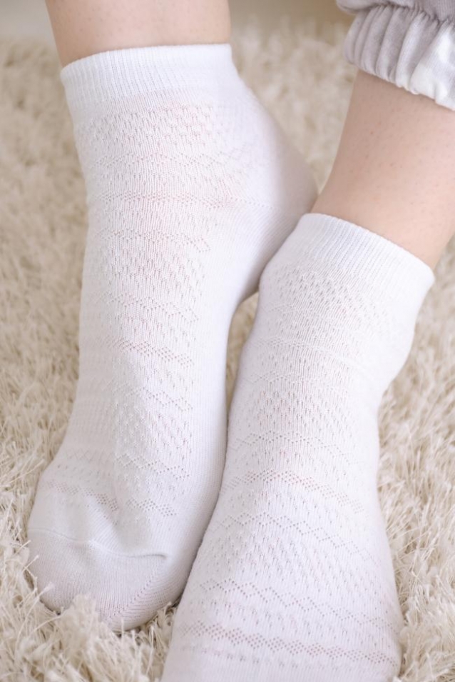 Ажурные женские носочки в спокойных оттенках - бежевом и белом. На резинке, по верху ажурный рисунок, по стопе - гладкие. В упаковке 2 пары одного цвета.
