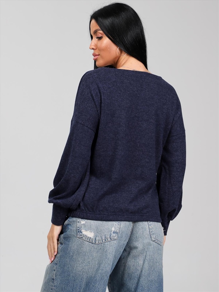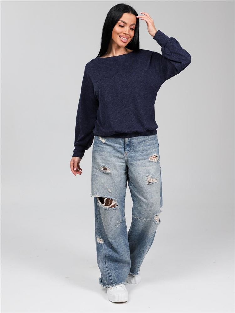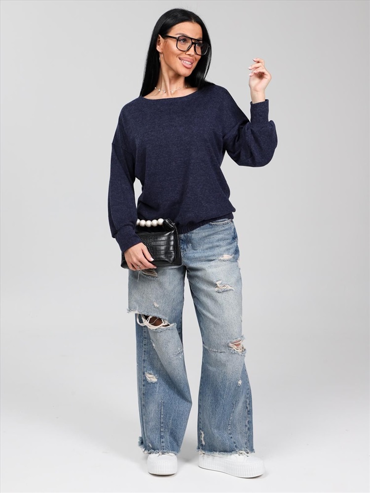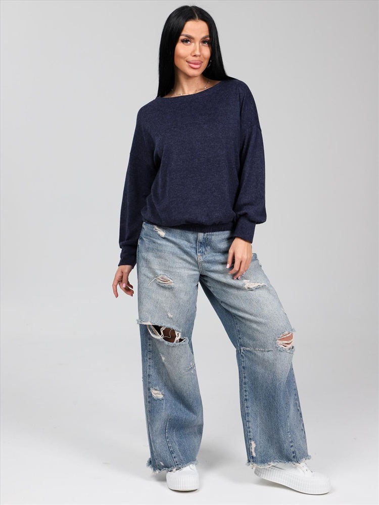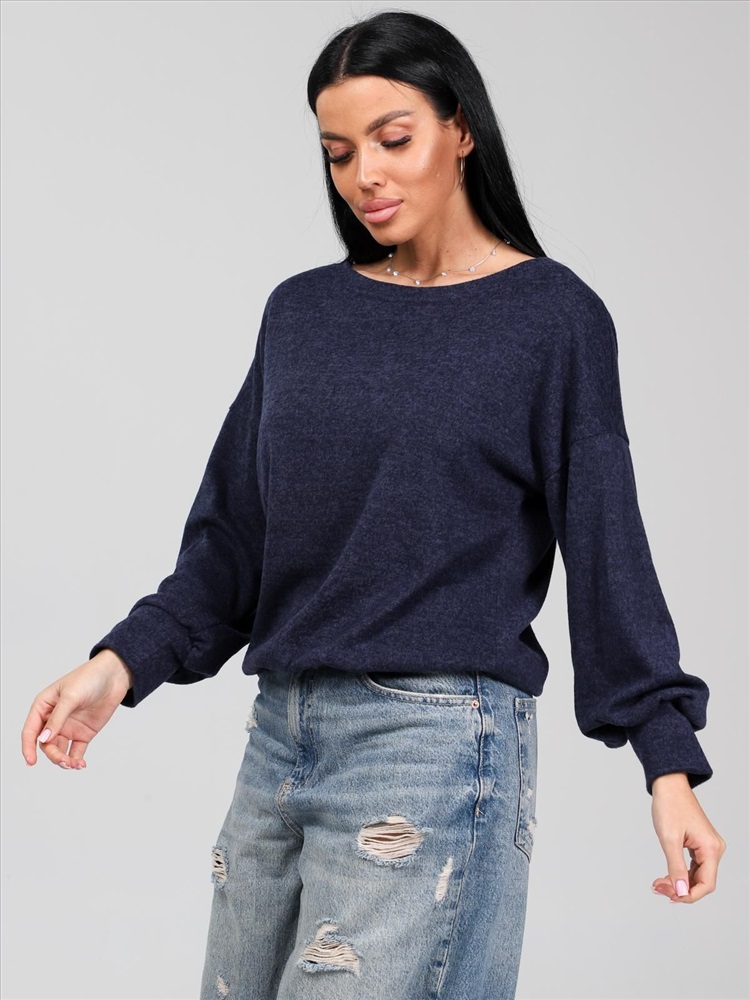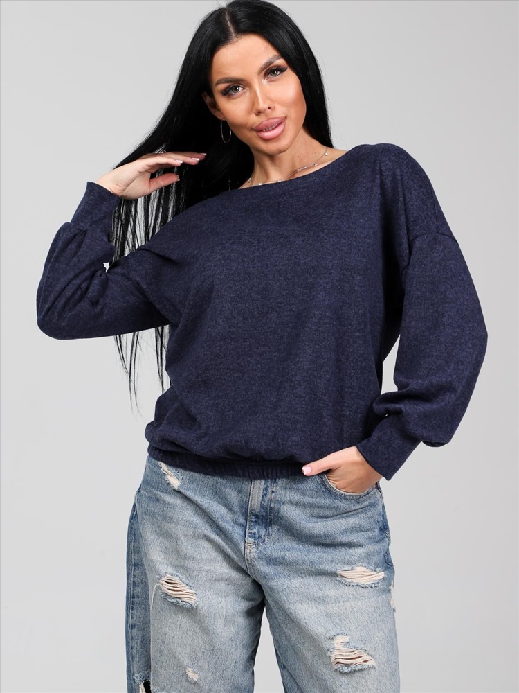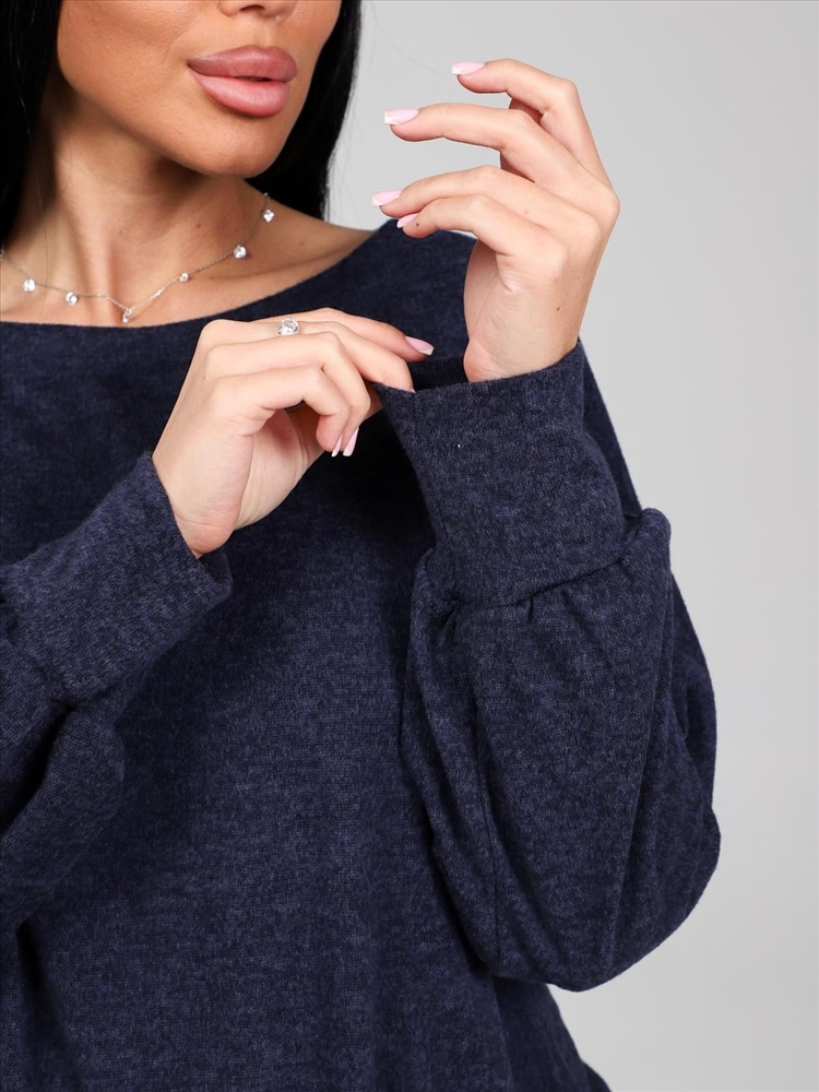 Женский джемпер изготовлен из полотна "ангора". Модель свободного покроя, плечо спущенное, длинный рукав на манжете, низ джемпера на поясе.
