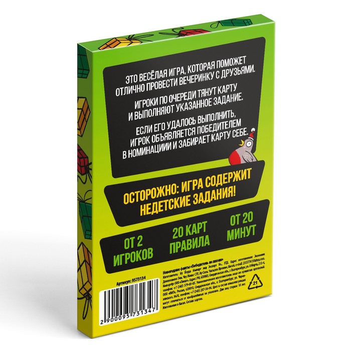 Габариты: 1 x 6,5 x 9,5 Страна: Китай В боксе: 416 шт Состав: Картон Материалы: картон Фасовка: по 1 шт Индивидуальная упаковка: Плёнка Габариты товара: 0,8 см × 6,5 см × 9,5 см Сертификат: Не подлежит сертификации Возраст: От 18 лет Символ года: Нет Тематика праздника: Новый год Возраст: Взрослый Материал: Картон, Бумага Количество игроков: От 3 игроков Время игры: 20 минут Жанр игры: Фанты и подвижные Повод для игры: Новый год, Вечеринка Фиксированная цена: Да Осторожно: игра содержит недетские задания! Это весёлая игра, которая поможет отлично провести вечеринку с друзьями. Игроки по очереди тянут карту и выполняют указанное задание. Если его удалось выполнить, игрок объявляется победителем в номинации и забирает карту себе. Состав: