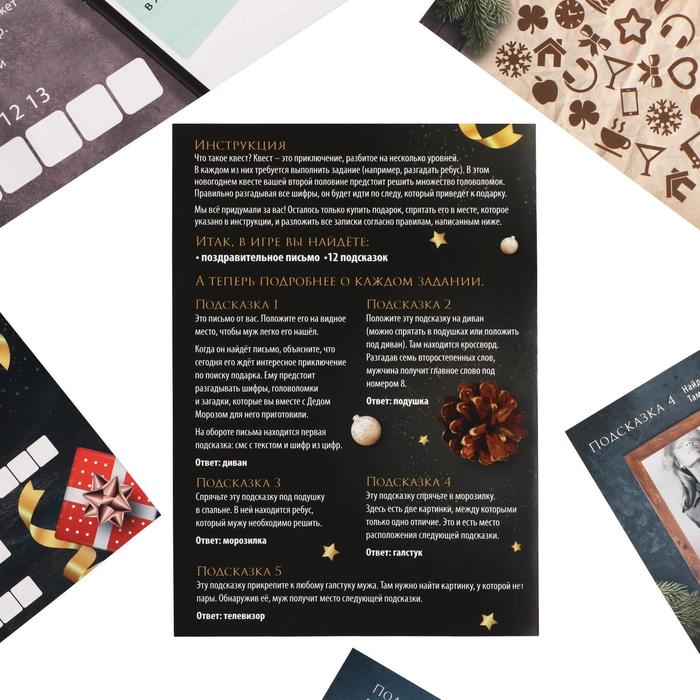 Габариты: 0,3 x 21 x 15 Страна: Китай В боксе: 100 шт Состав: Бумага, картон Материалы: бумага, картон Фасовка: по 1 шт Индивидуальная упаковка: Плёнка Сертификат: Не подлежит сертификации Для кого: Для мужчины Возраст: От 16 лет Количество карт: 12 Символ года: Нет Тематика праздника: Новый год Возраст: Взрослый Материал: Картон, Бумага Количество игроков: От 1 игрока Время игры: 10 минут Жанр игры: Квесты и психологические Повод для игры: Праздник, Вечеринка, Новый год Количество игроков: 1 Фиксированная цена: Да Новогодний квест по поиску подарка Как порадовать любимого в самый волшебный праздник года? Устройте для него незабываемое приключение-квест, по итогам которого он получит подарок. Все задания уже составлены, осталось только купить презент и спрятать его в надёжном месте. И сюрприз готов! Что нужно делать? Для начала подготовьте подарок (в комплект не входит). Затем внимательно изучите все подсказки. В них вашей второй половине предстоит решить множество головоломок. Правильно разгадывая все шифры, возлюбленный будет идти по следу, который приведёт к презенту. Разложите подсказки по квартире, а потом пройдите тем же маршрутом, чтобы проверить, всё ли в порядке. В комплекте также есть поздравительное письмо, которое нужно поместить на самое видное место. На обороте послания находится первая подсказка. Это увлекательное приключение принесёт множество положительных эмоций и подарит вашему мужу настоящий праздник! Внутри вы найдёте: