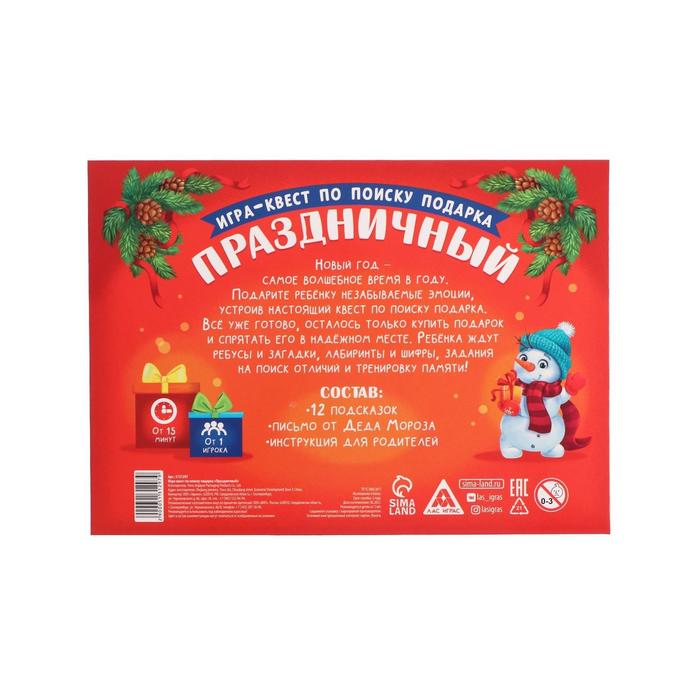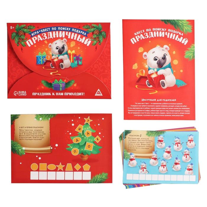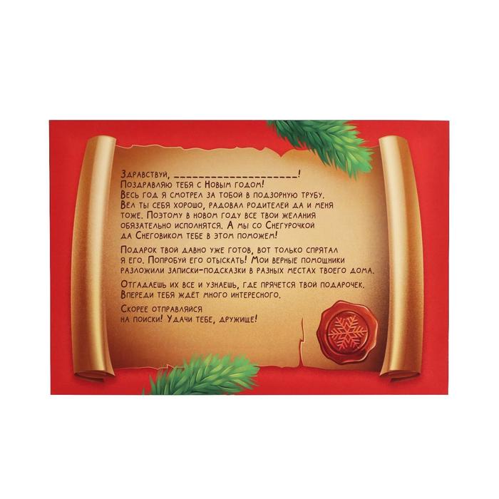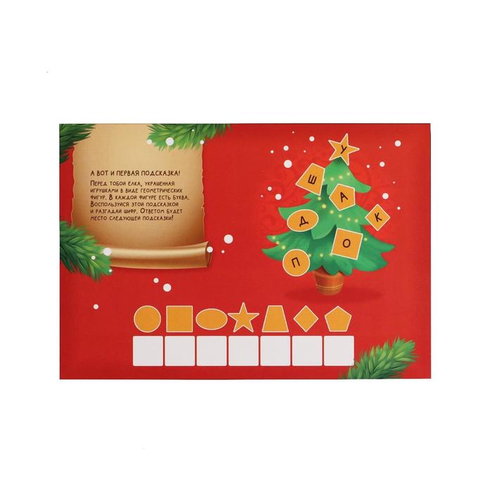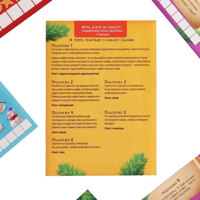 Габариты: 0,3 x 21 x 15 Страна: Китай В боксе: 100 шт Состав: Бумага, картон Материалы: бумага, картон Фасовка: по 1 шт Индивидуальная упаковка: Плёнка Сертификат: ЕАС Возраст: От 5 лет Символ года: Нет Тематика праздника: Новый год Материал: Картон, Бумага Количество игроков: От 1 игрока Время игры: 15 минут Жанр игры: Квесты и психологические Развитие навыков: Моторика, Память, Реакция, Внимание Материал: Картон Фиксированная цена: Да Новогодний квест по поиску подарка Новый год — самое волшебное время. Подарите ребёнку незабываемые эмоции, устроив настоящий квест. Всё уже готово, осталось только купить презент и спрятать его в надёжном месте. Ребёнка ждут ребусы и загадки, лабиринты и шифры, задания на поиск отличий и тренировку памяти! Что нужно делать? Для начала подготовьте подарок (в комплект не входит). Затем внимательно изучите все подсказки. В них ребёнку предстоит решить множество головоломок. Правильно разгадывая все шифры, он будет идти по следу, который приведёт к презенту от Дедушки Мороза. Разложите подсказки по квартире, а потом пройдите тем же маршрутом, чтобы проверить, всё ли в порядке. В комплекте также есть письмо от Деда Мороза, которое нужно поместить на самое видное место. На обороте послания находится первая подсказка. Это увлекательное приключение принесёт множество положительных эмоций и подарит ребёнку настоящий праздник! Внутри вы найдёте: